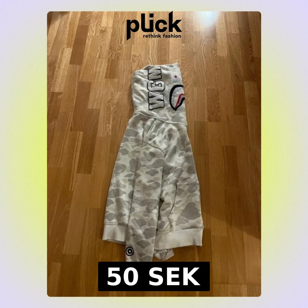 Säljer en BAPE shark hoodie i ljus camo med ikonisk hajdesign på huvan och broderade WGM-bokstäver. Tröjan har hel dragkedja, ribbade muddar och fickor. Färgerna går i beige, grått och vitt. Perfekt för dig som gillar streetwear och vill sticka ut.