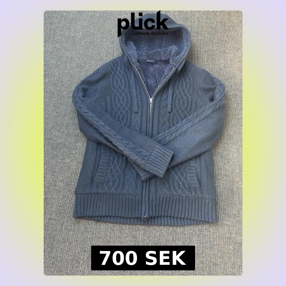 Mysig mörkblå hoodie med stickat flätmönster och dragkedja framtill. Insidan är fodrad med mjuk teddy för extra värme. Huva med dragsko och ribbade muddar vid ärmslut och nederkant. Perfekt för kalla dagar och riktigt skön att ha på sig. Jätte fint skick storlek L
