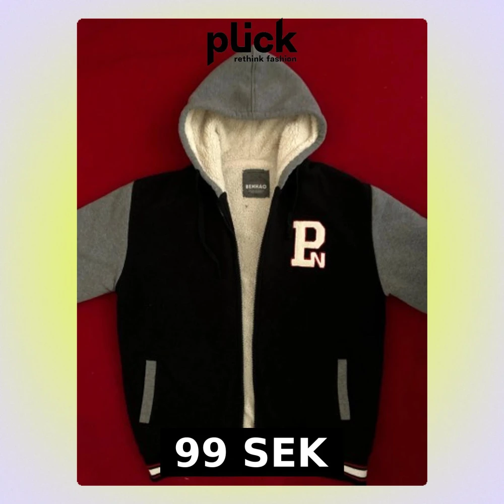 Snygg hoodie i collegemodell från Benhao med svart kropp och grå ärmar samt huva. Insidan är fodrad med mjuk, vit teddy. Broderad PN-logga på bröstet och randiga muddar i svart, vitt och rött. Två fickor framtill och dragkedja. Perfekt för en avslappnad streetwear-look.