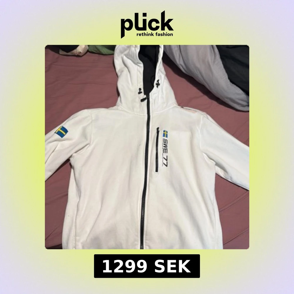 Vit hoodiejacka med svensk flagga på ärmen och bröstet samt texten SWE 77. Jackan har dragkedja framtill och en ficka med dragkedja på bröstet. Perfekt för dig som gillar segling eller vill ha en sportig stil. Väldigt sällsynt hoodie