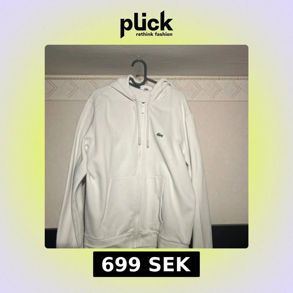 Säljer en stilren vit hoodie från Lacoste med dragkedja och klassisk krokodil-logga på bröstet. Perfekt för en avslappnad stil. Den har en huva med dragsko och praktiska fickor framtill. Storlek XL men passar L
