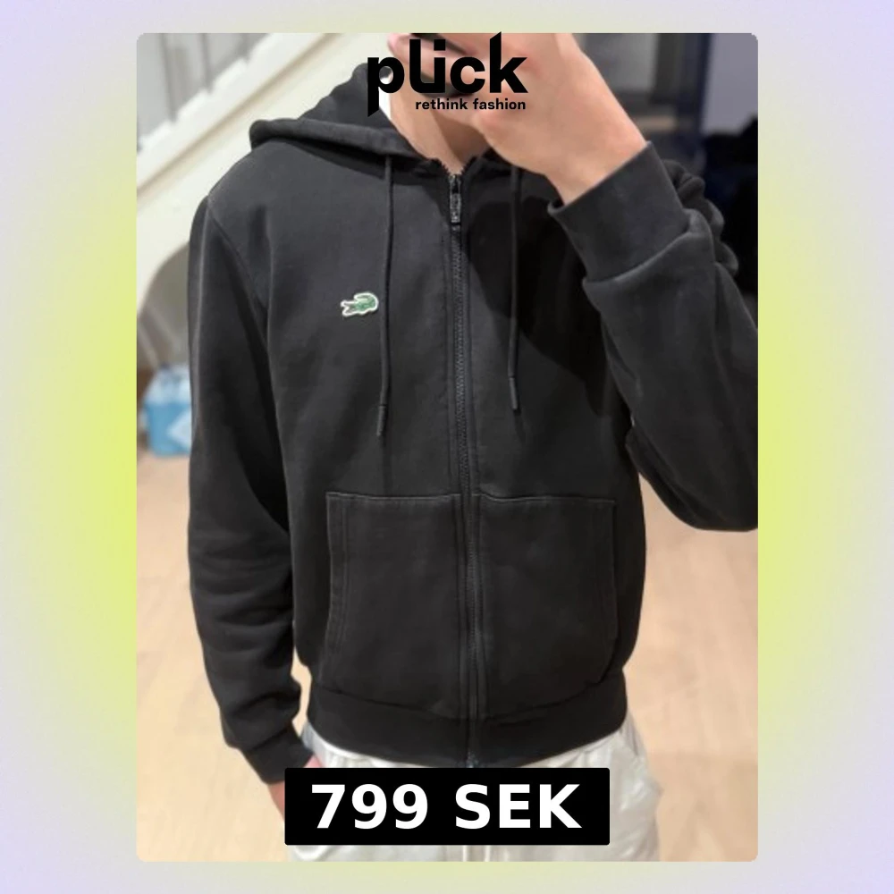 Svart hoodie från Lacoste med klassisk krokodillogga på bröstet. Tröjan har huva med snörning, två stora fickor framtill och dragkedja hela vägen. Mjuk bomullskänsla och ribbade muddar vid ärmslut och nederkant. Perfekt för chill dagar.