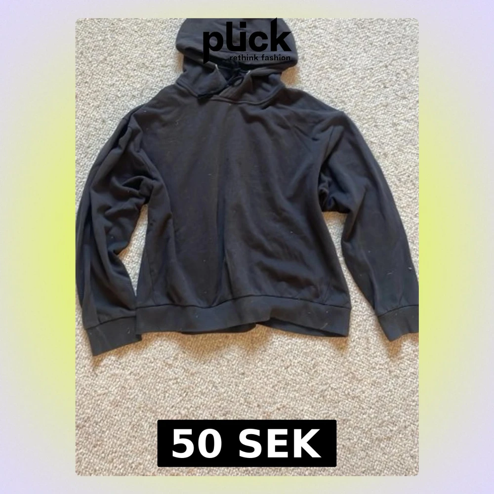 En enkel svart hoodie med huva och långa ärmar. Klassisk passform och ribbade muddar vid ärmslut och nederkant. Perfekt för en avslappnad stil. Materialet ser ut att vara mjuk bomullsblandning.