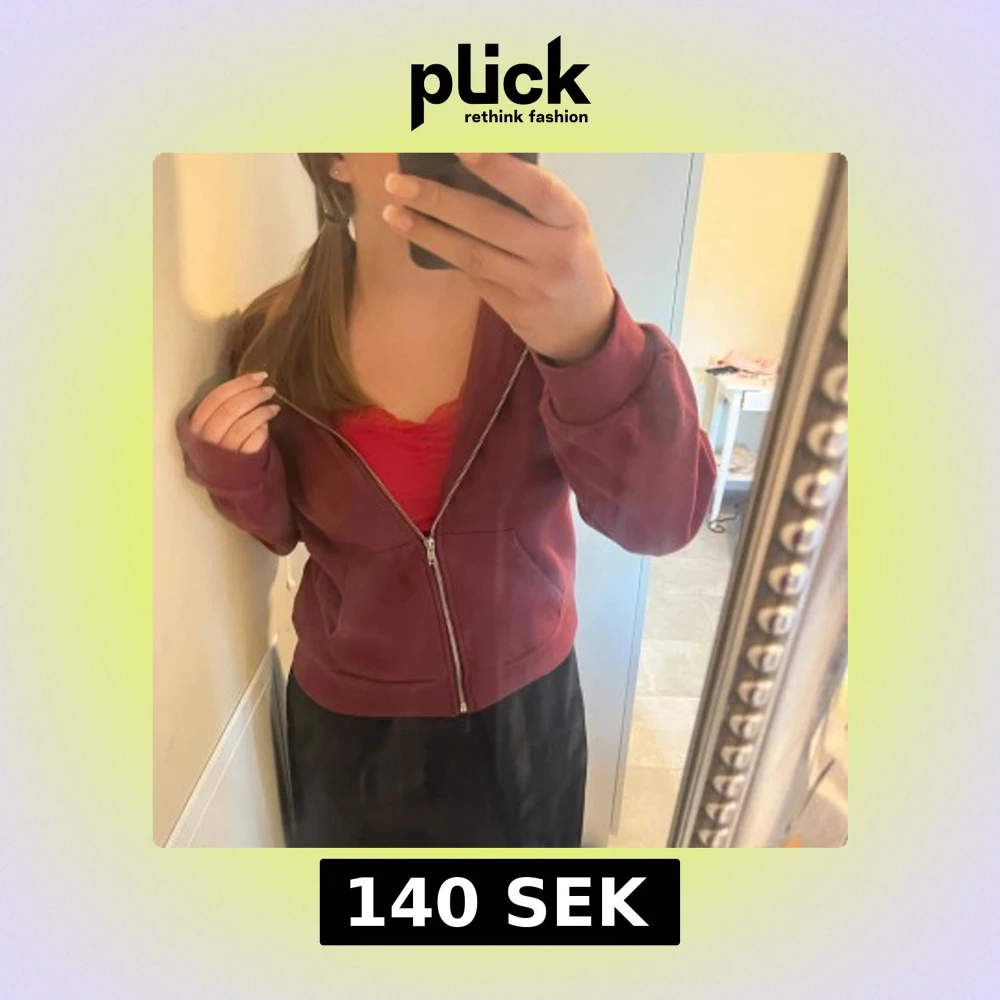 Säljer en mysig vinröd hoodie med dragkedja och huva. Den har långa ärmar och praktiska fickor framtill. Perfekt för en avslappnad stil.