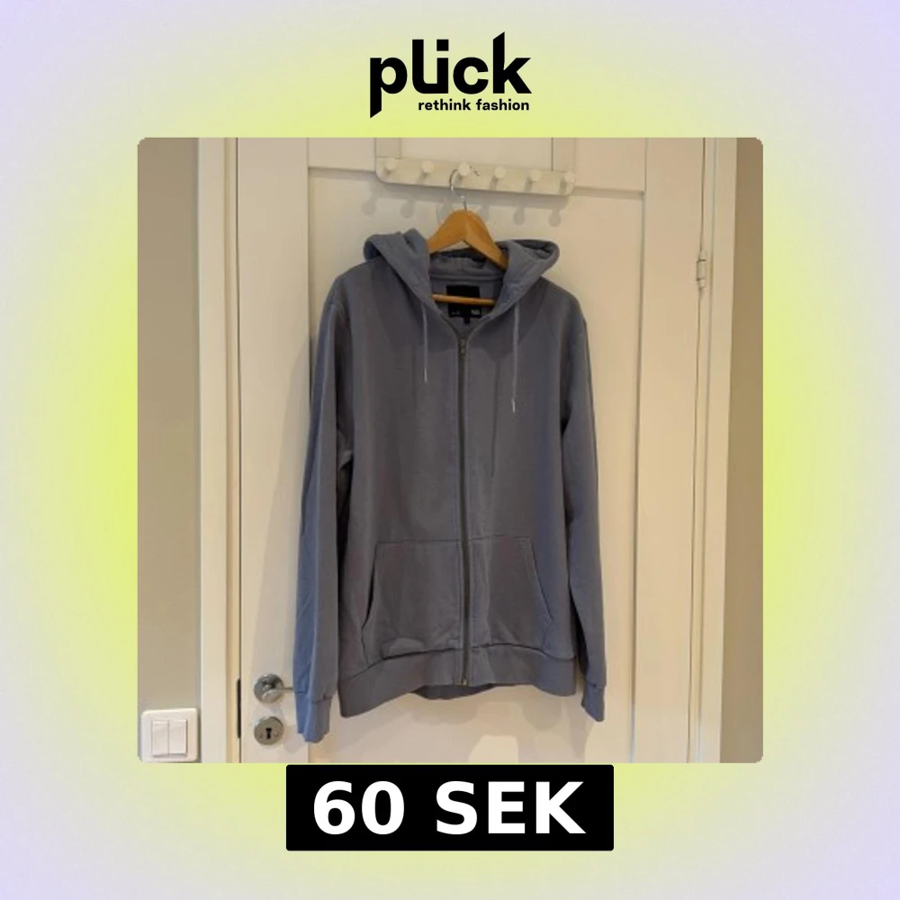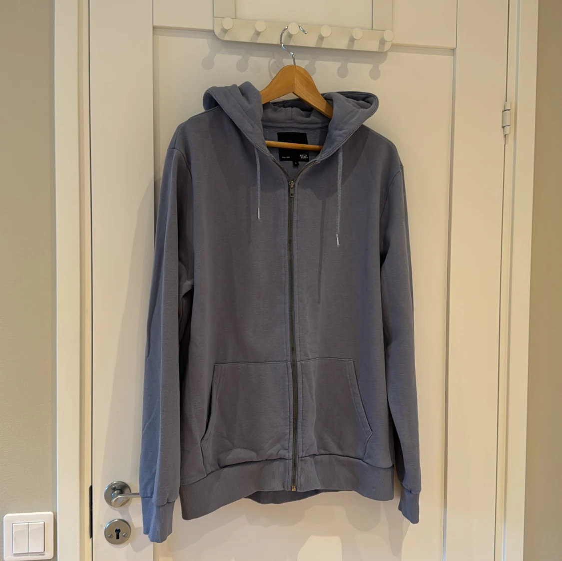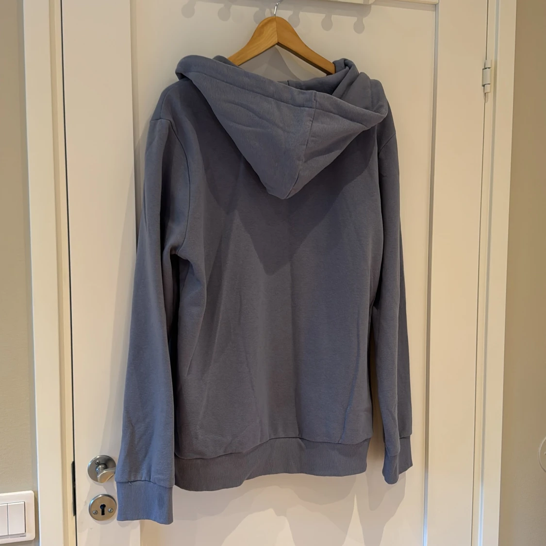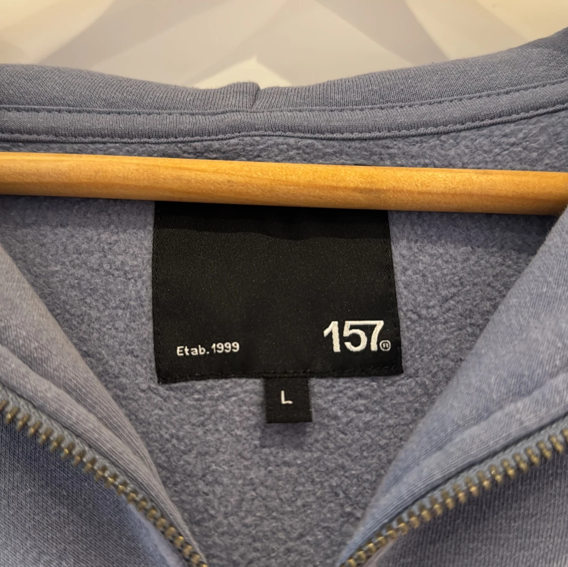 Mysig blå hoodie från 157 i storlek L. Tröjan har huva med snörning, hel dragkedja och två stora fickor framtill. Tillverkad i mjuk bomullsmix, perfekt för chill dagar. Enkel och stilren design som funkar året runt.