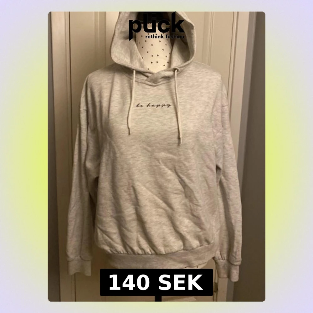 Mysig ljusgrå hoodie med huva och snörning. På bröstet står det 'be happy'. På ryggen är det en regnbåge. Hoodien har ribbade muddar vid ärmslut och nederkant samt en relaxed passform. Det är en lite fläck på övremagen. Perfekt för chill dagar.