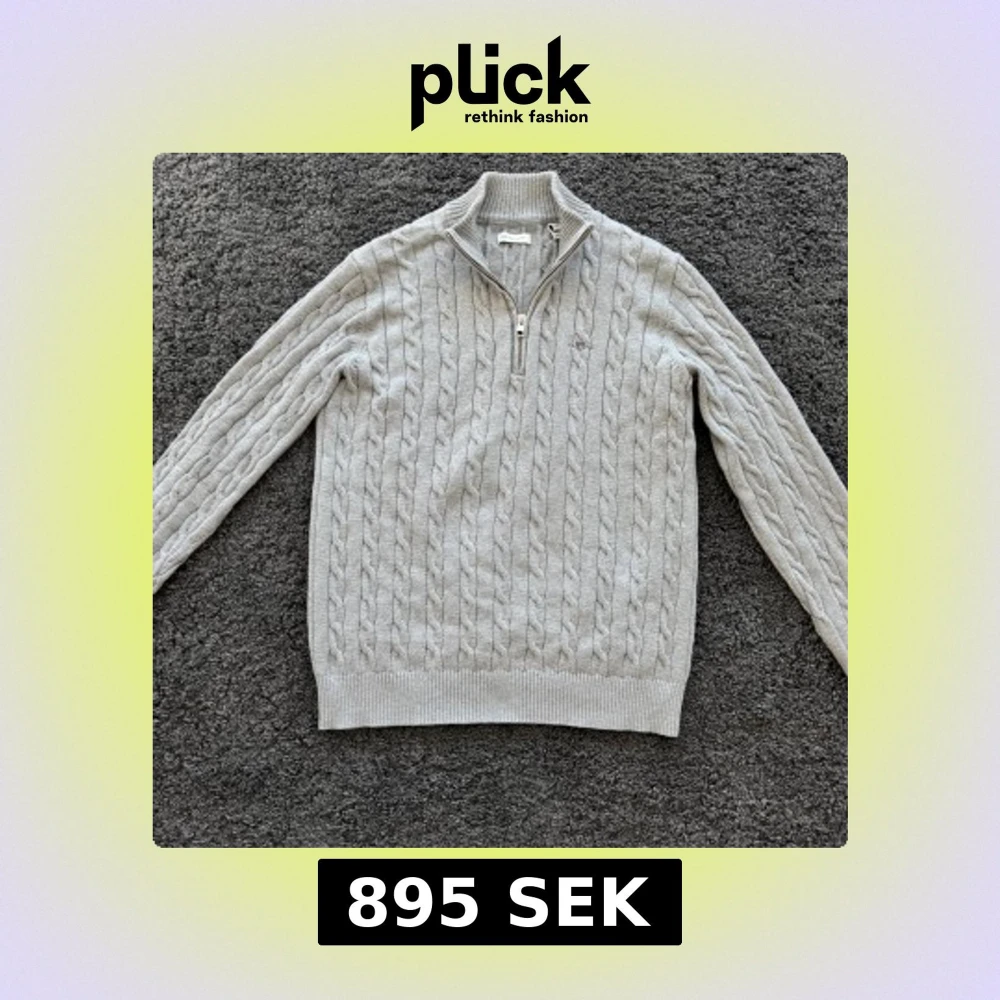 Säljer en ljusgrå stickad tröja från GANT med halv dragkedja och kabelstickat mönster. Tröjan har hög krage och broderad logga på bröstet. Perfekt för kyliga dagar. Sparsamt använd och köpt för en månad sedan på Emporia