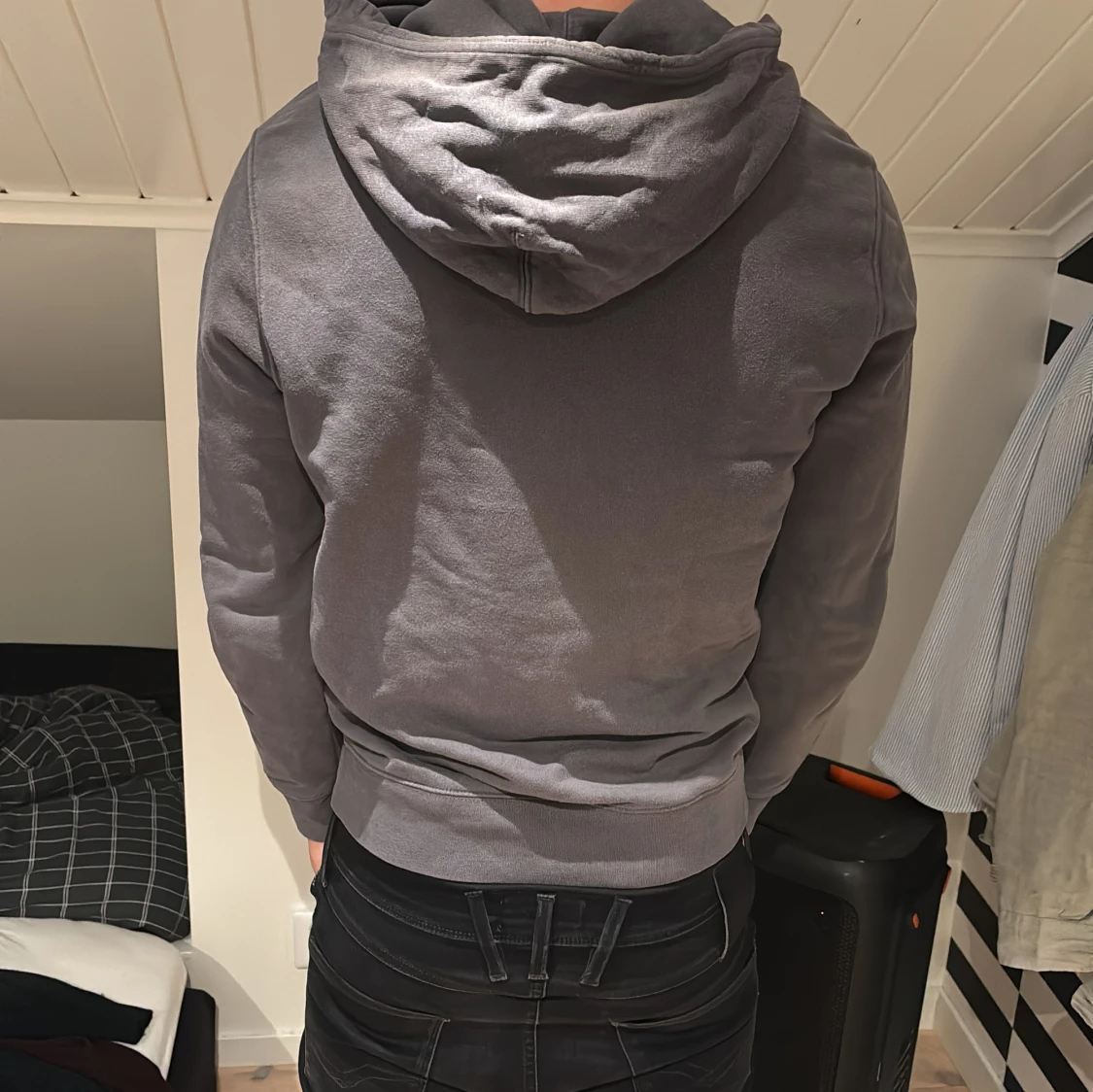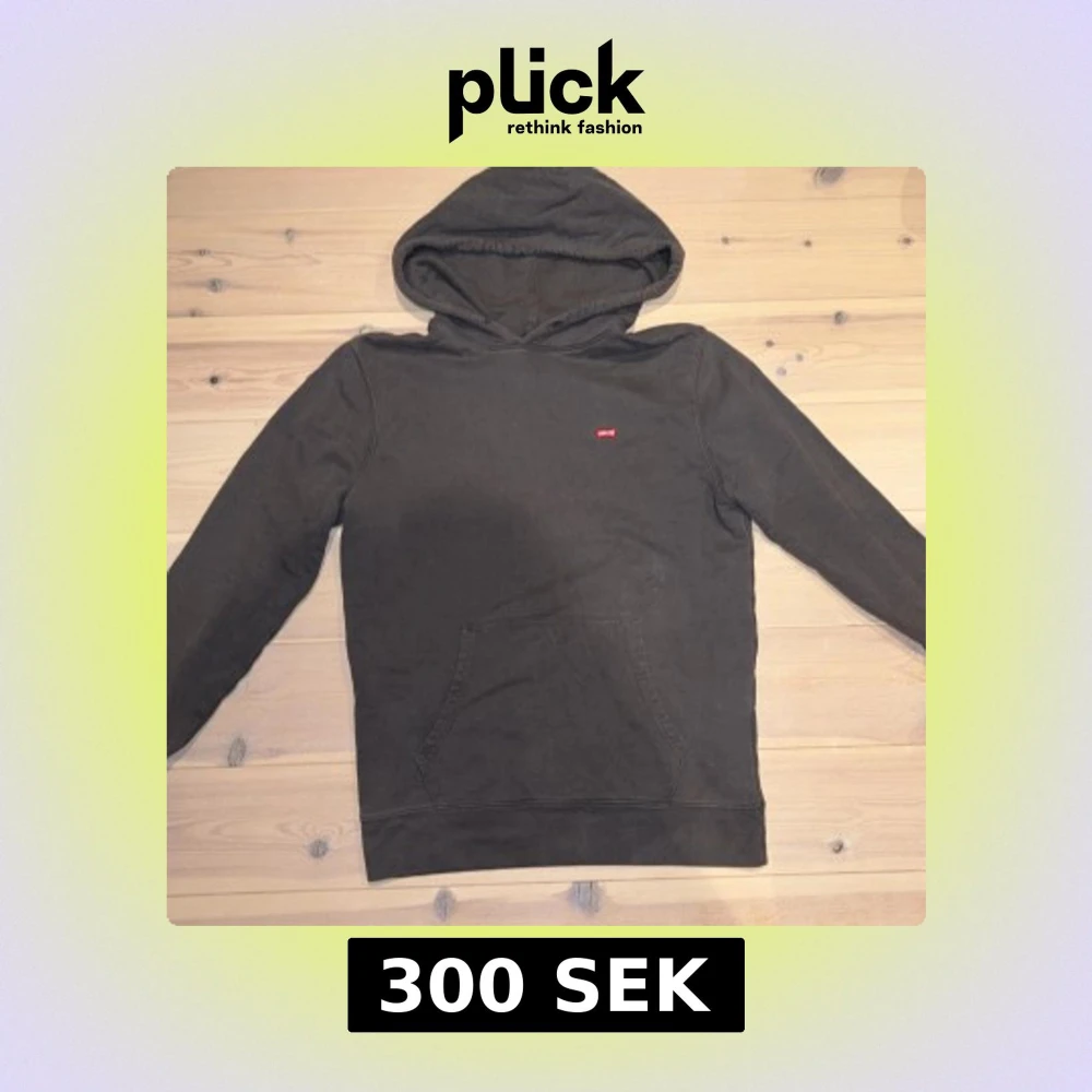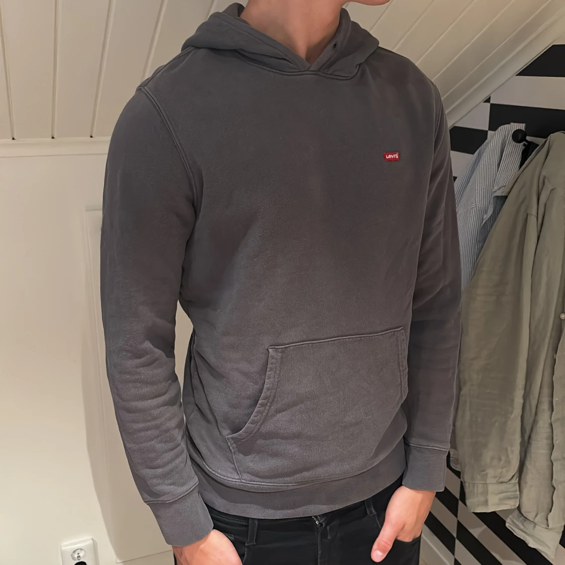Säljer en stilren mörkgrå hoodie från Levi's med klassisk känguruficka och liten röd logotyp på bröstet. Tröjan har huva och långa ärmar, perfekt för chill dagar. Materialet är mjukt och skönt, troligtvis bomullsmix. Storlek S.