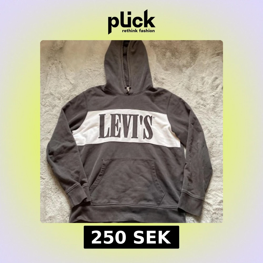 En hoodie från Levi’s. Den är använd men i bra skick utan större skador. Snöre än till luvan går att få med om det önskas. Tröjan har en snygg vintage look och passar till det mesta. Pris går att diskuteras vid snabb affär.