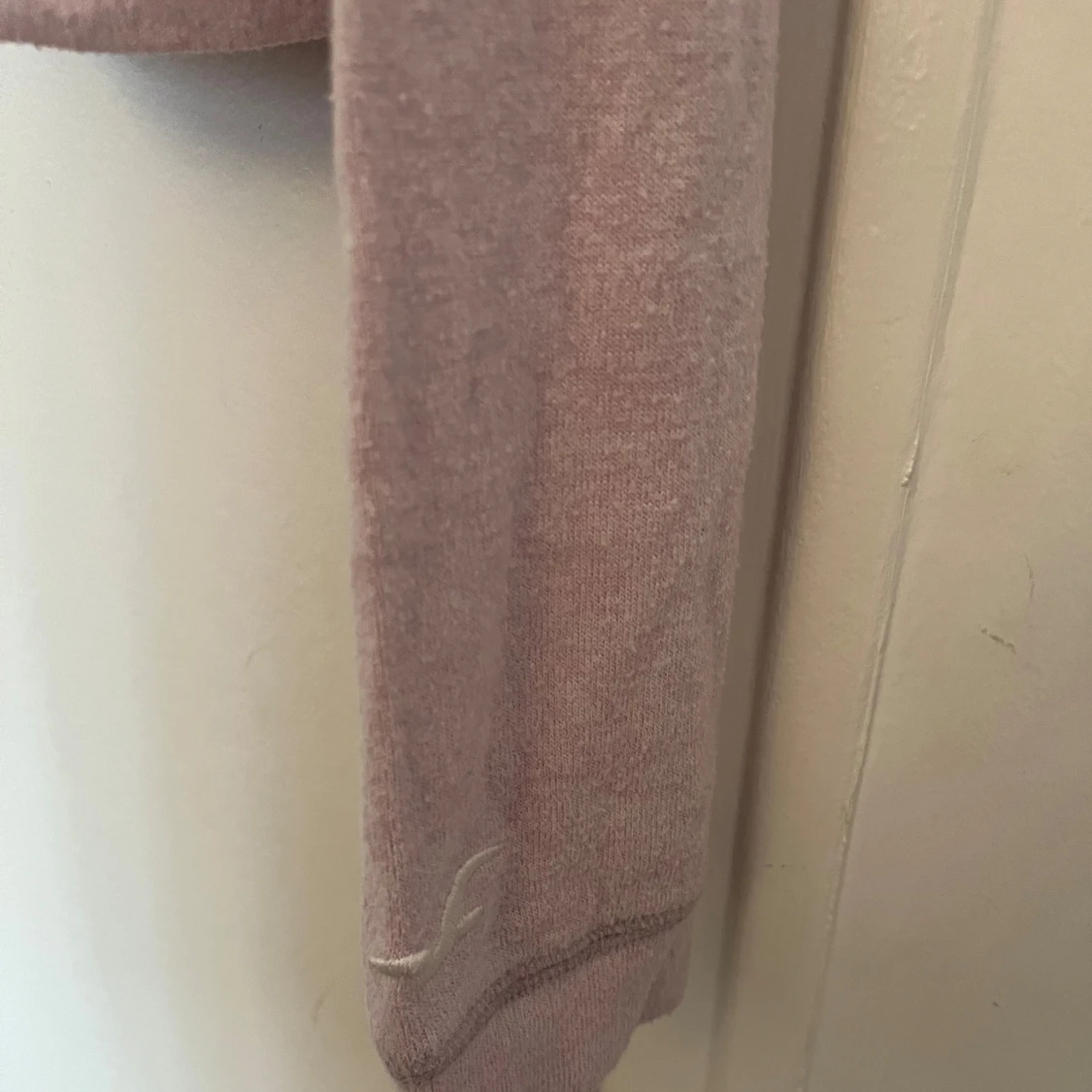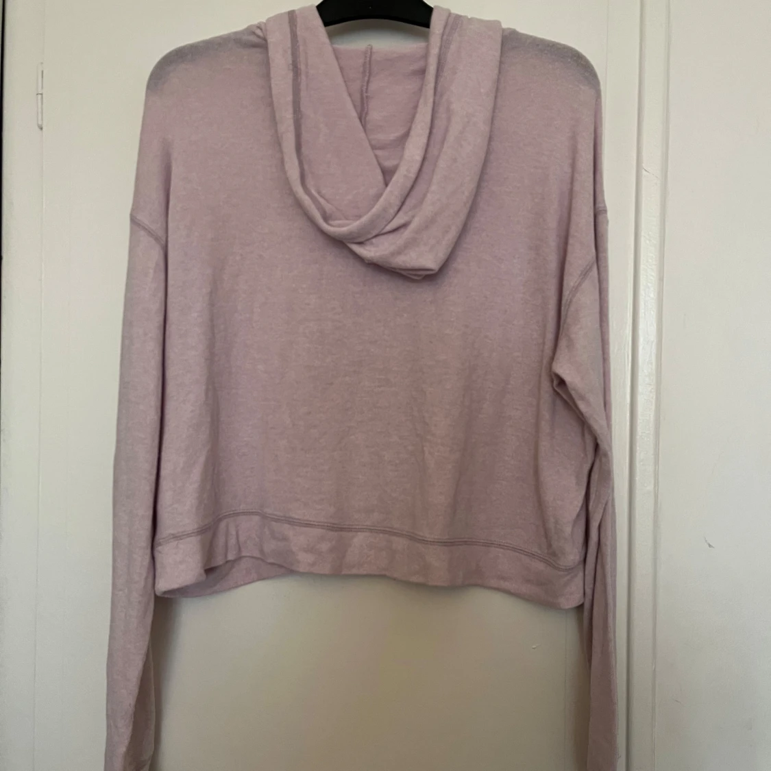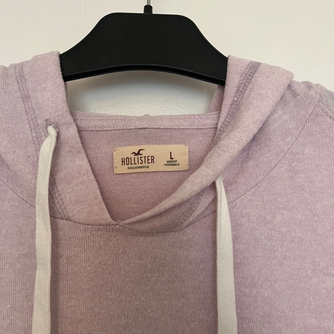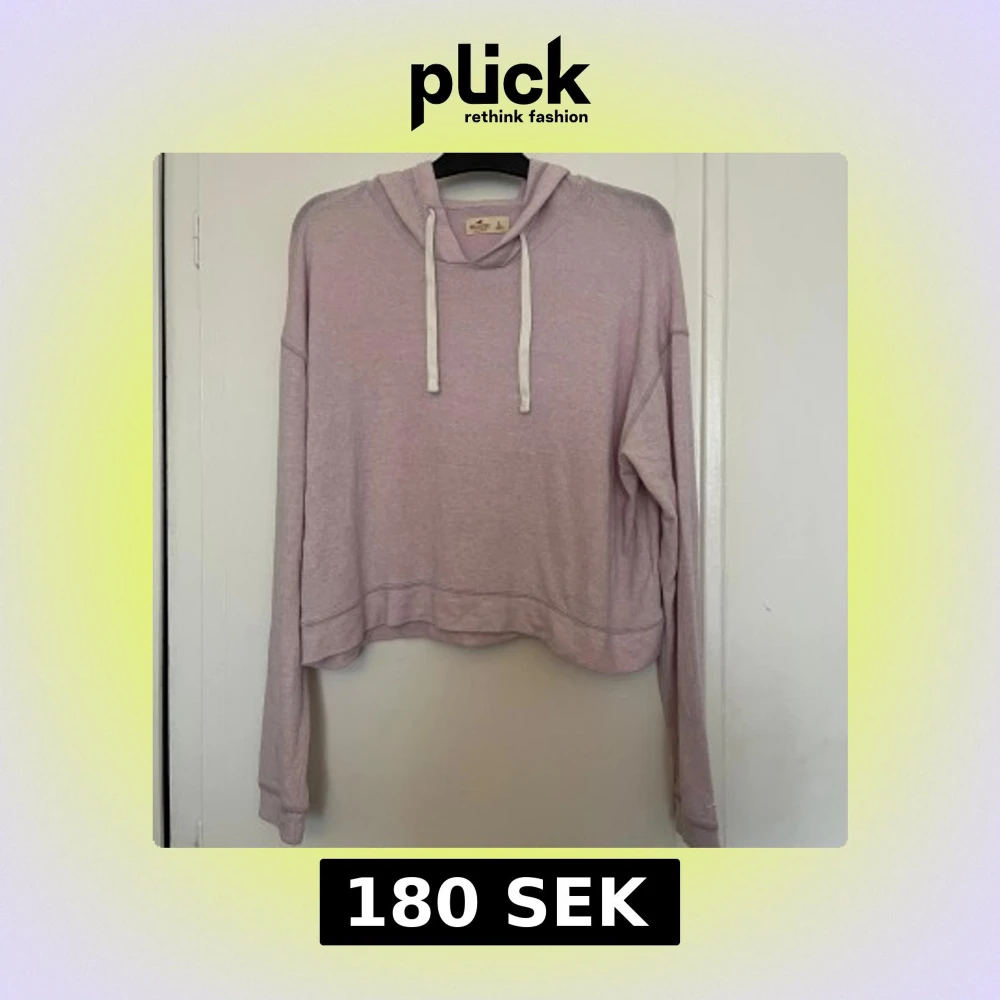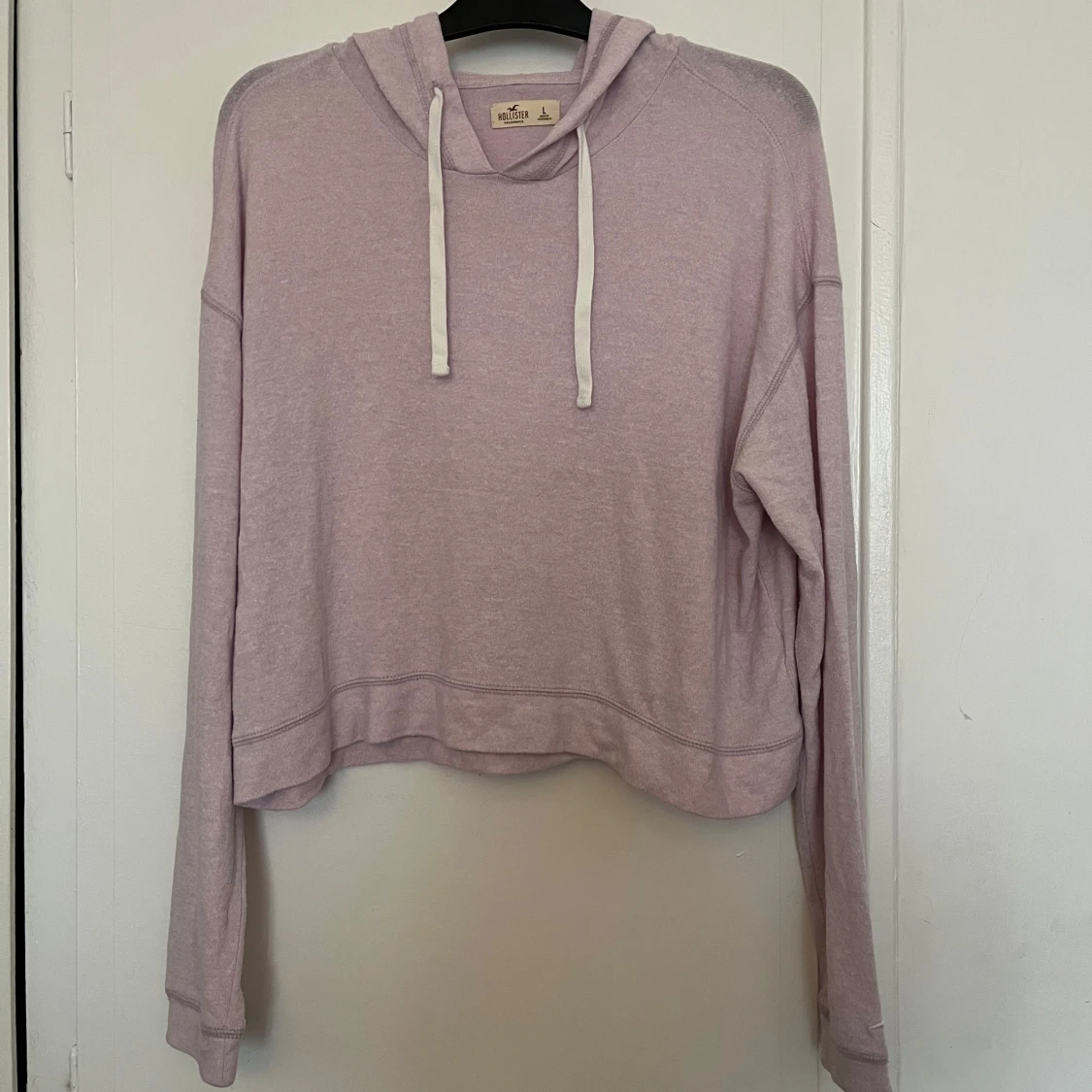 Ljusrosa hoodie från Hollister. Den har en croppad design med långa ärmar och en justerbar huva med vita snören. Finns en liten fläck längst ner på framsidan men går att tvätta bort 🩷