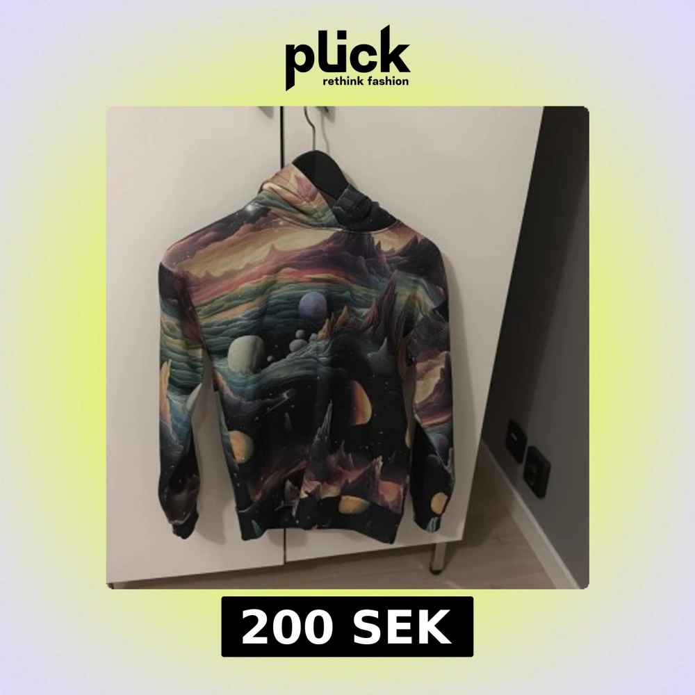Unik hoodie med ett färgstarkt galaxmotiv som täcker hela tröjan. Mönstret har planeter, berg och rymdlandskap i nyanser av svart, lila, blått, beige och orange. Tröjan har huva och långa ärmar, perfekt för dig som gillar coola prints och vill sticka ut.