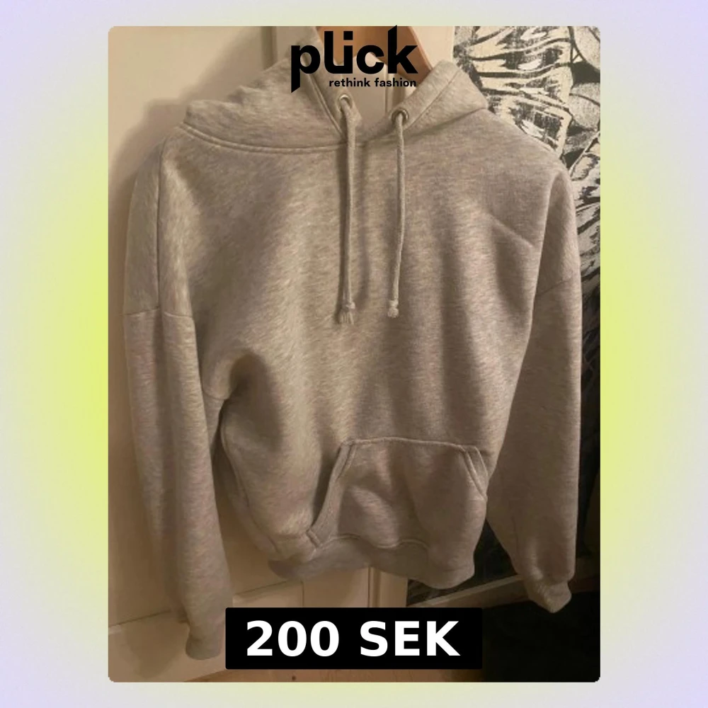 En stilren ljusgrå hoodie med huva och dragsnören. Hoodien har en klassisk känguruficka framtill och ribbade muddar vid ärmslut och nederkant. Storlek xs men funkar för s också!