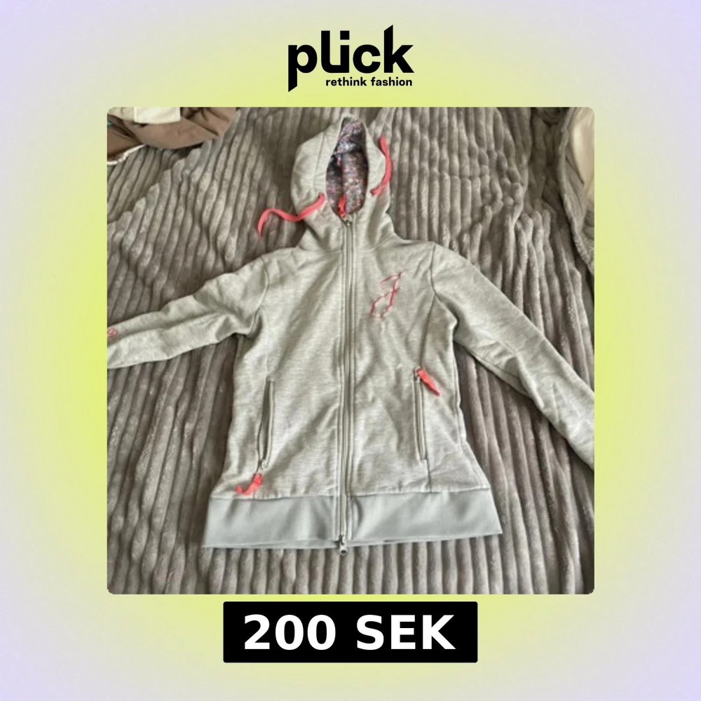 Ljusgrå hoodie med dragkedja, rosa snören och blommigt foder i huvan. Broderad bokstav 'J' på bröstet och texten 'Equestrian Stockholm' på ärmen. Två fickor med dragkedja och detaljer i rosa.