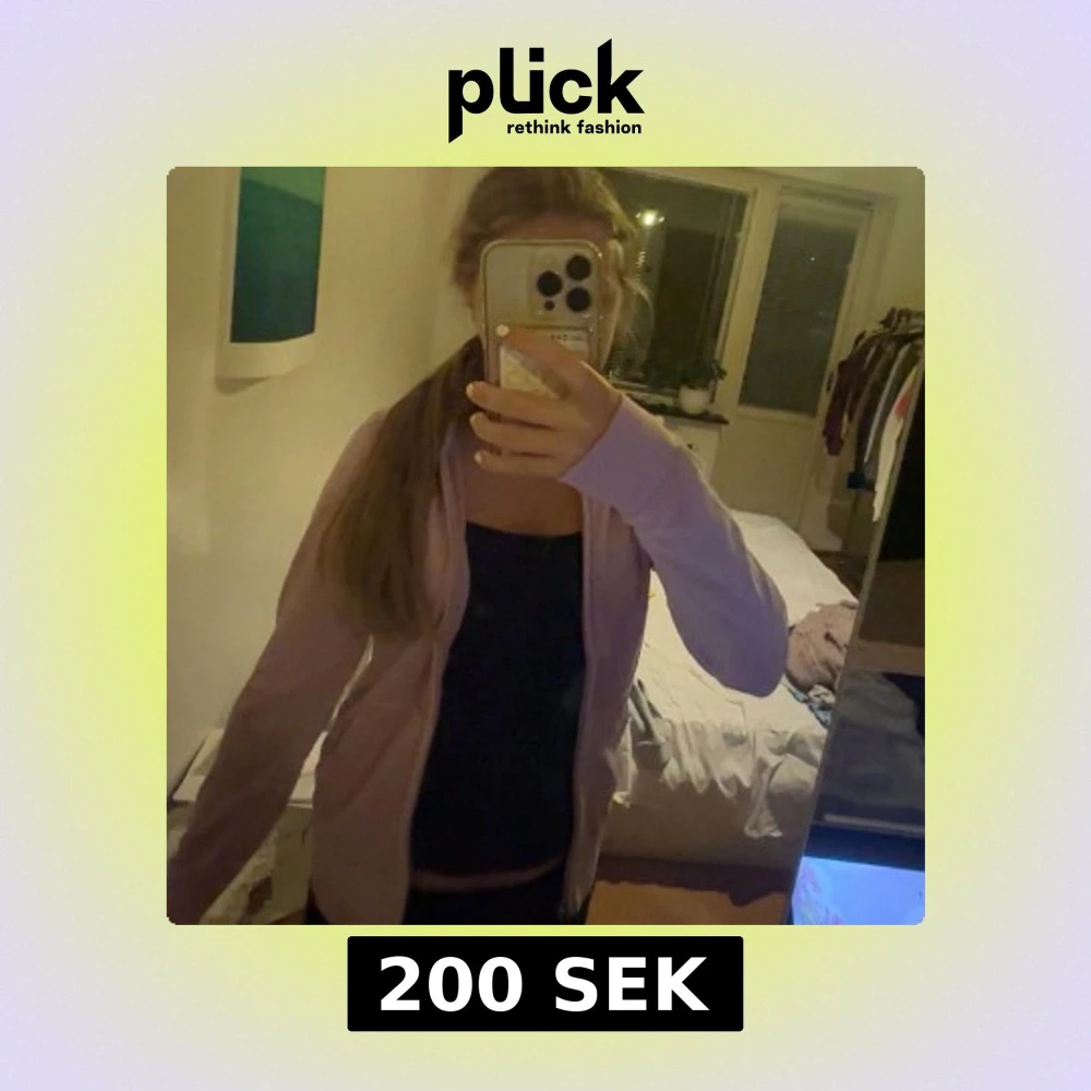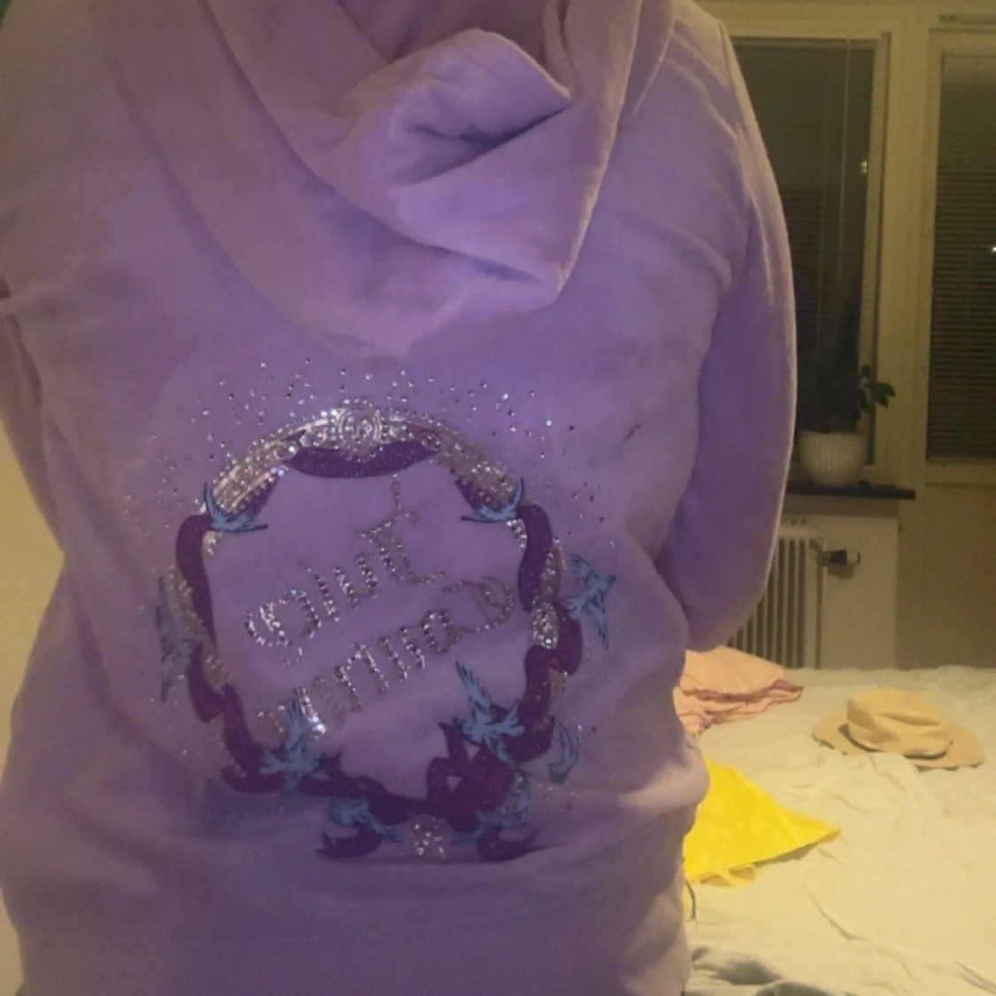 Säljer en ljuslila hoodie från Juicy Couture i mjuk velour med glittrig broderad logga och strassdetaljer på ryggen. Jackan har huva, dragkedja framtill och långa ärmar. Perfekt för dig som gillar bling och comfy vibes.