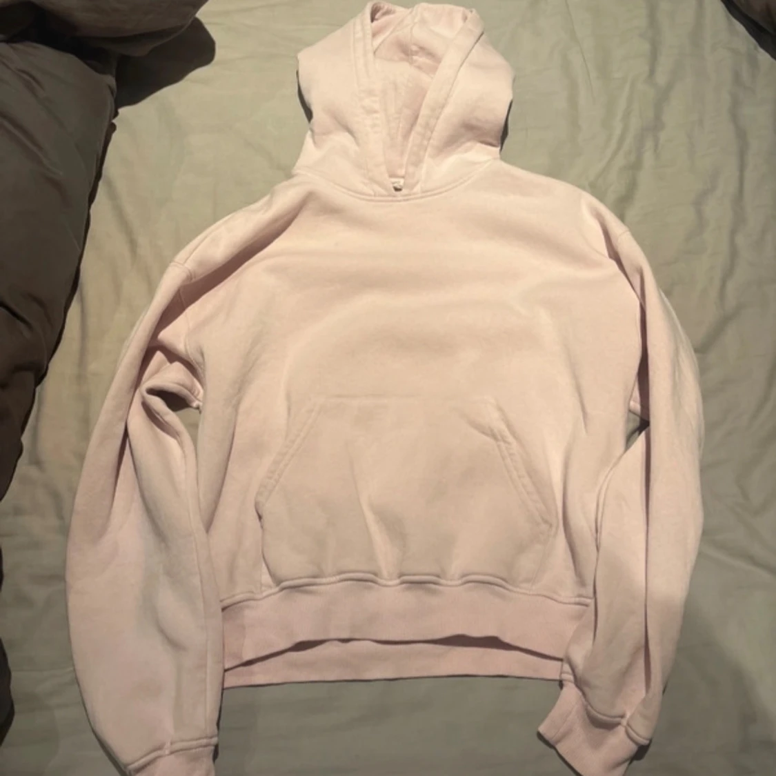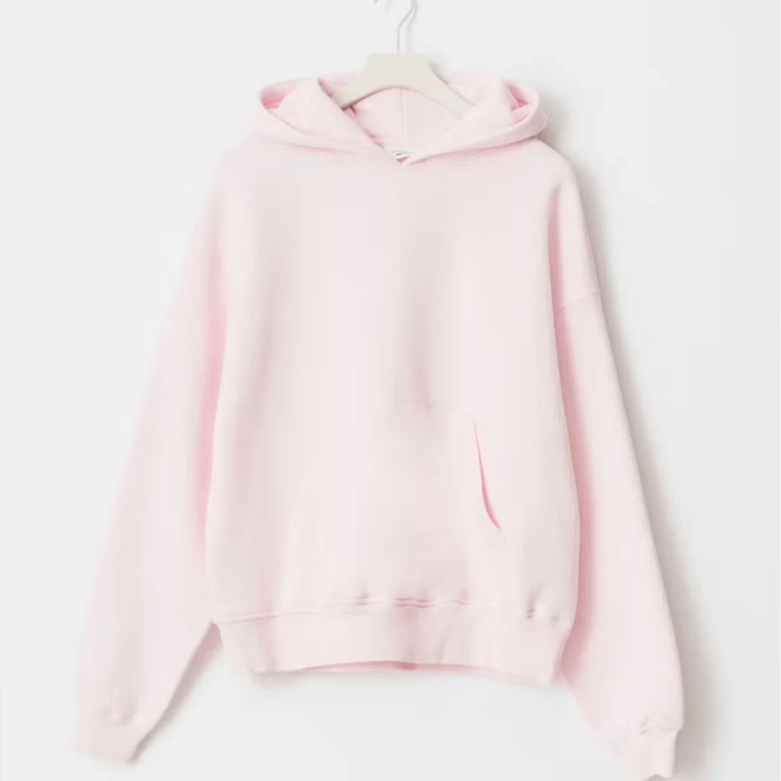 Hoodie med känguruficka framtill. Hoodien är rosa och har fodrad huva med dragsko. Den har nedhasade axlar och ribbad mudd vid ärmslut och i nederkant.
