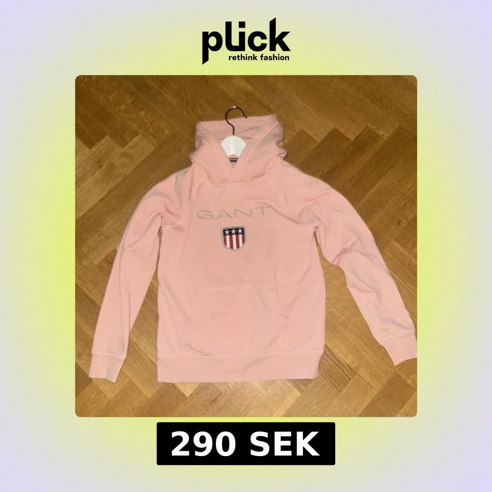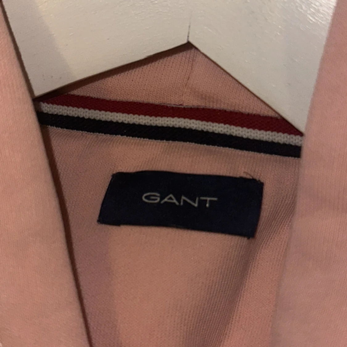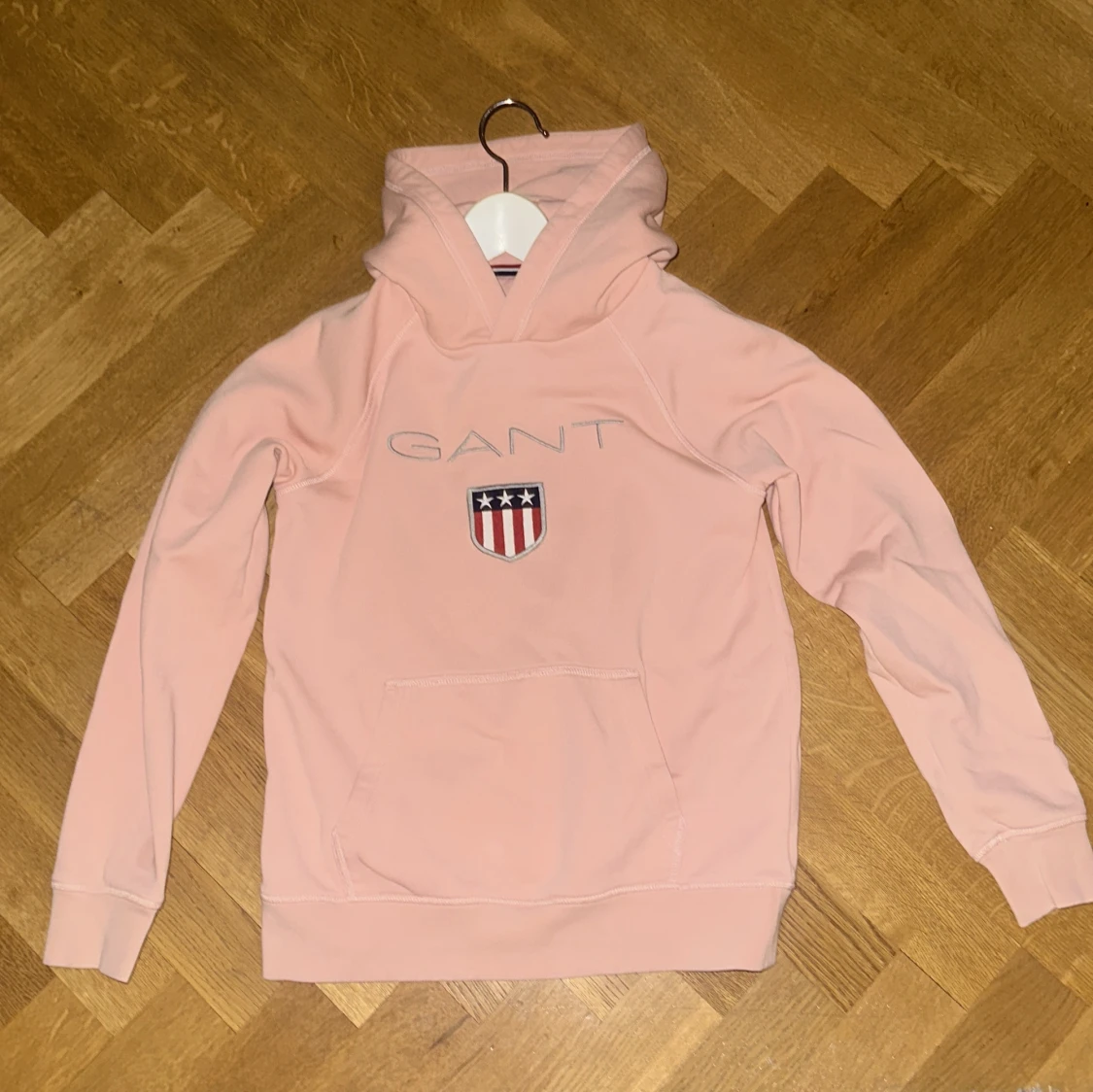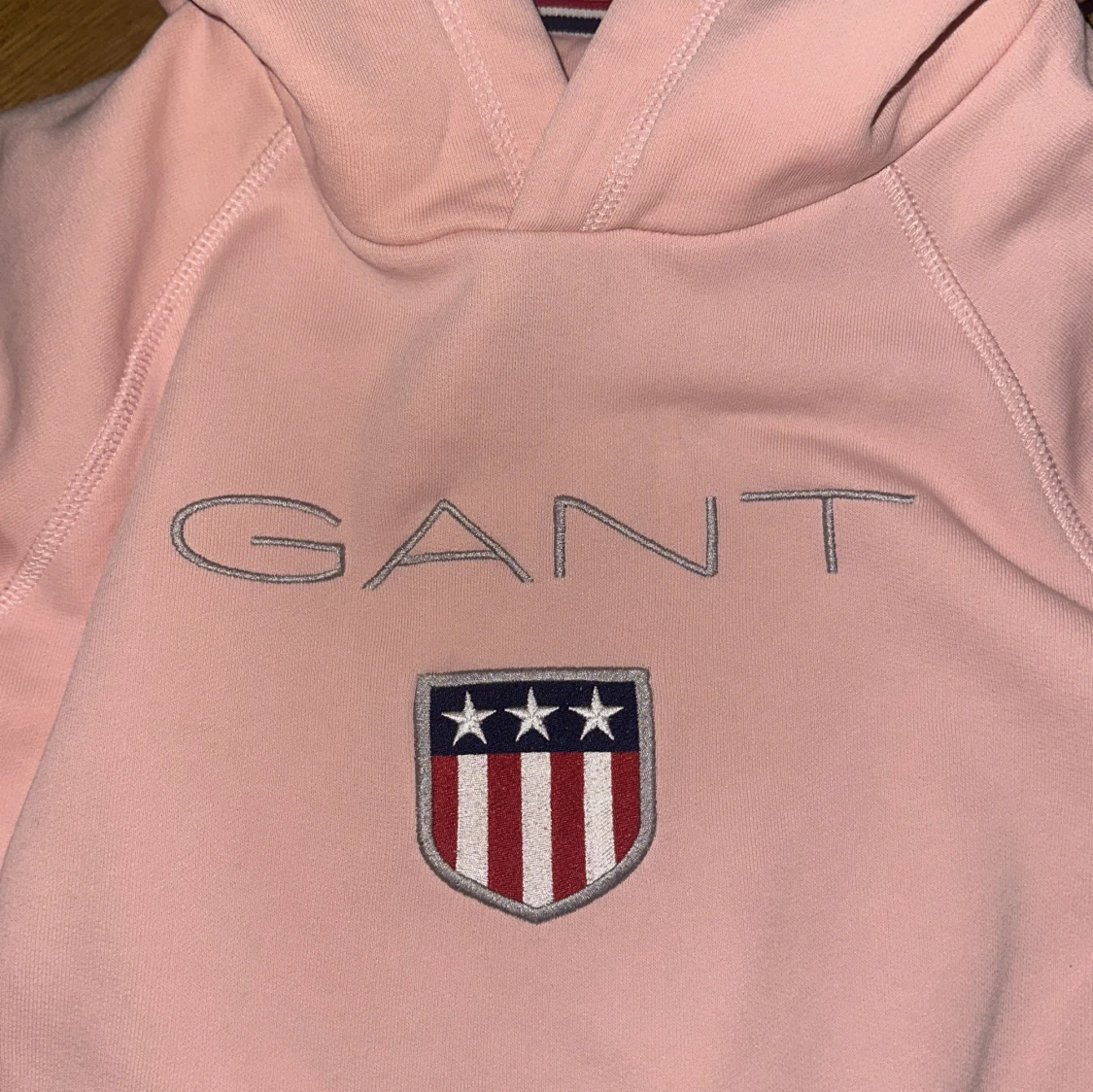 Säljer en ljusrosa hoodie från GANT med broderad logga och sköld på bröstet. Tröjan har huva, magficka och långa ärmar. Perfekt för dig som gillar klassisk och sportig stil.
