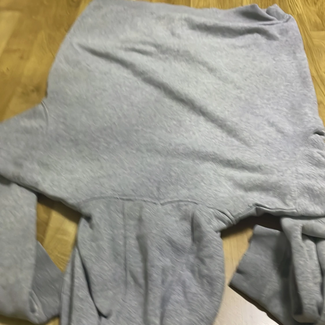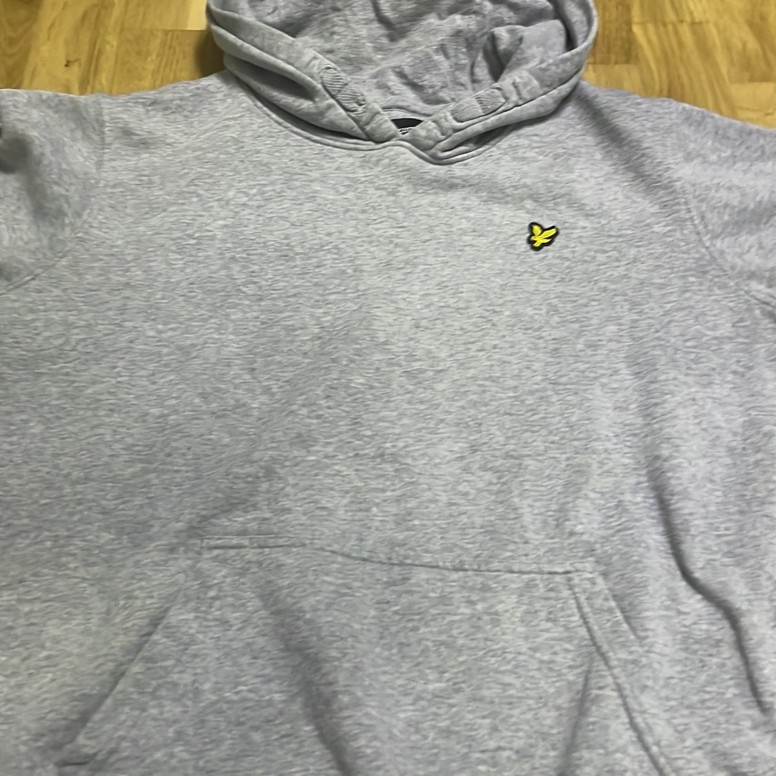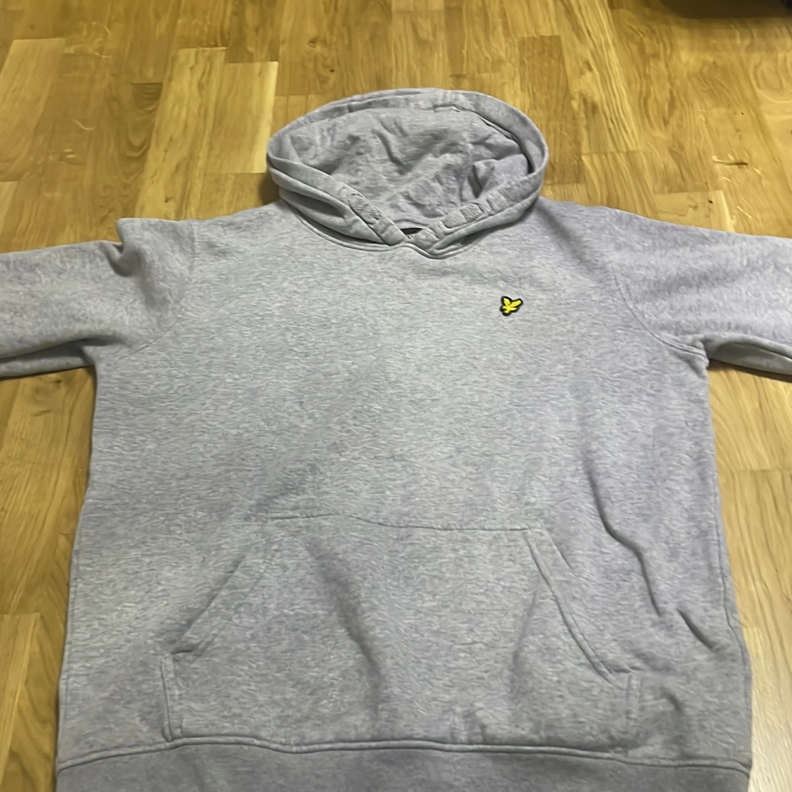 Säljer en stilren grå hoodie med en liten gul logotyp på bröstet. Tröjan har en klassisk känguruficka och en bekväm huva med dragsko. Perfekt för en avslappnad stil.