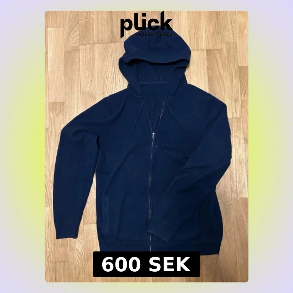 En enkel och stilren mörkblå hoodie med dragkedja framtill och huva. Hoodien har långa ärmar och två fickor på sidorna. Perfekt för en avslappnad look och lätt att matcha med andra plagg.
