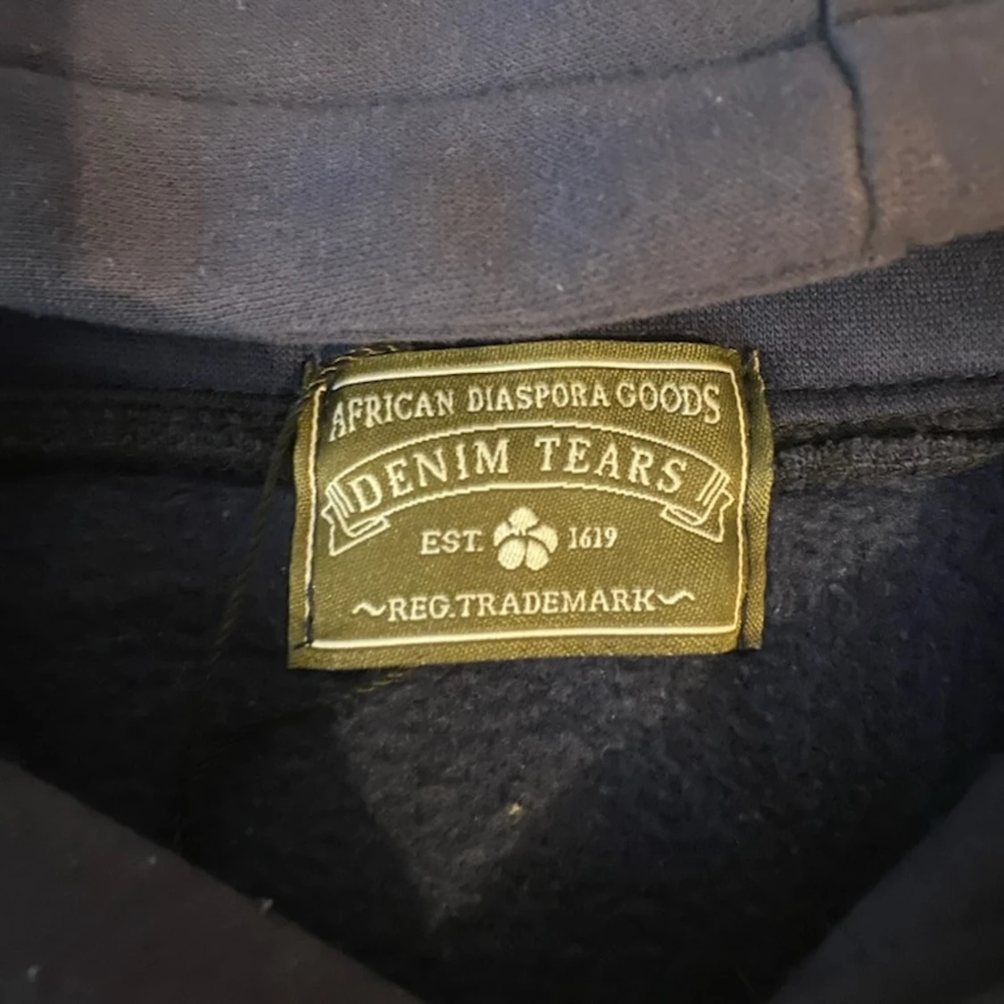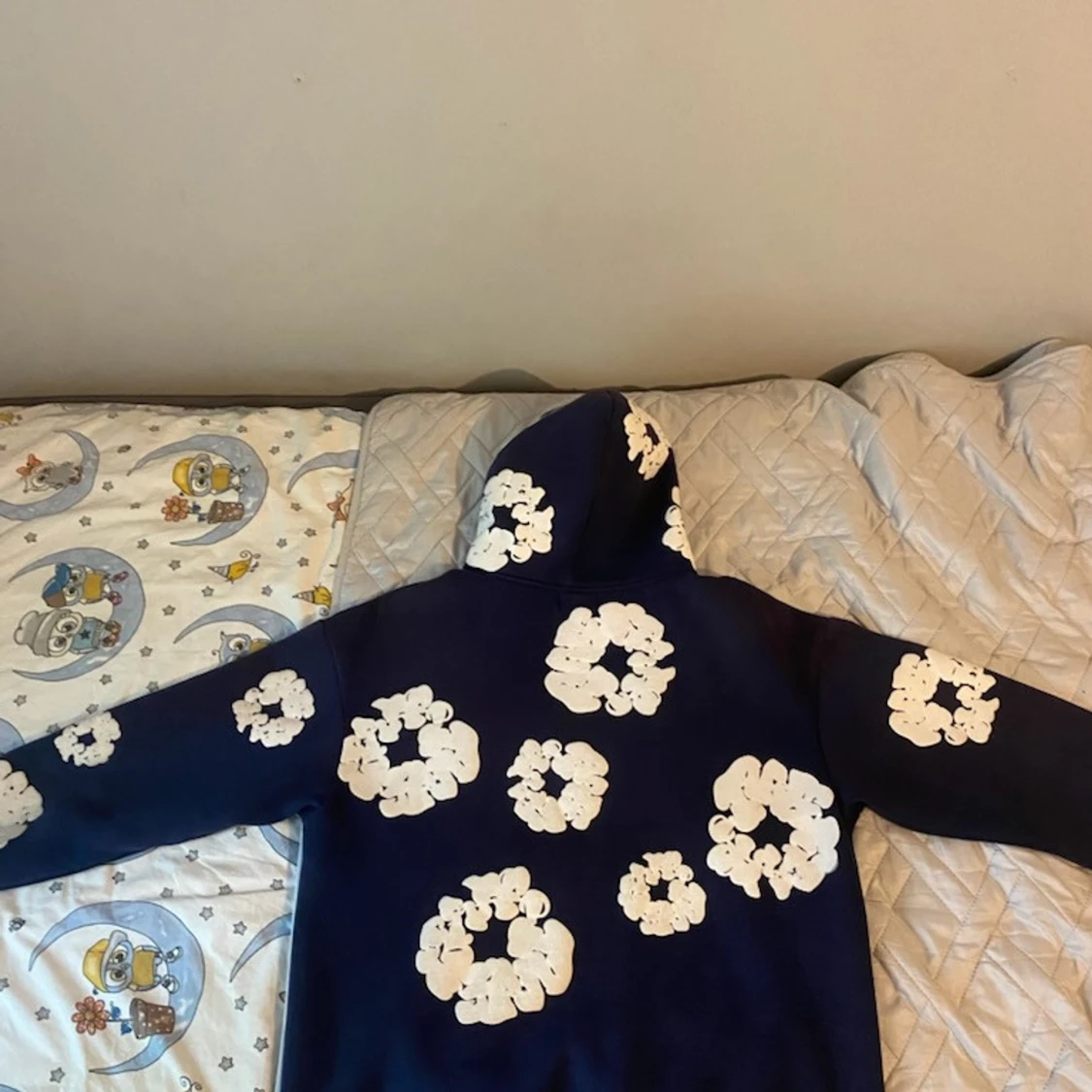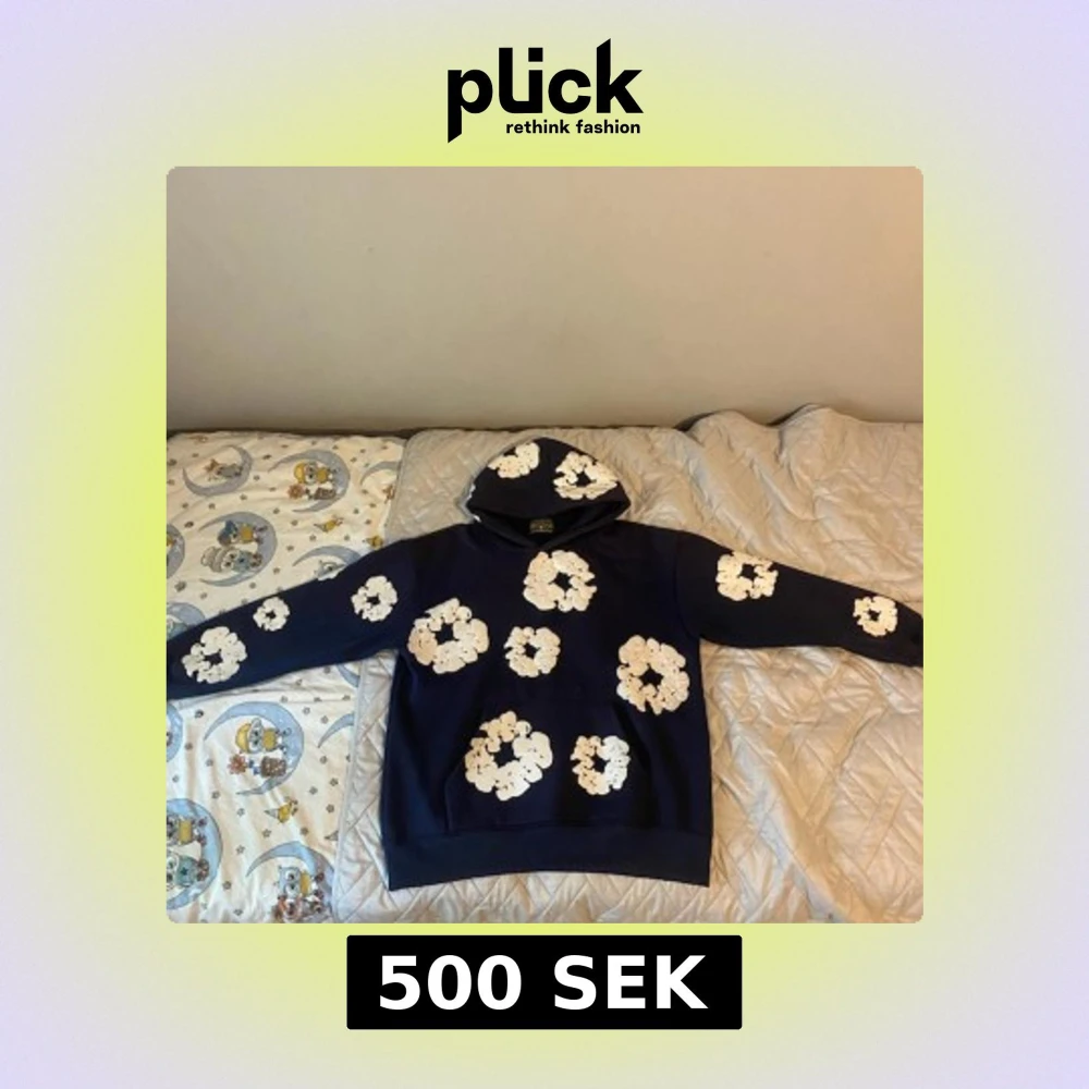 Säljer en blå hoodie från Denim Tears med stora vita blommönster över hela tröjan, även på huvan. Tröjan har klassisk känguruficka och huva. Perfekt för dig som vill sticka ut med en unik och kreativ stil.