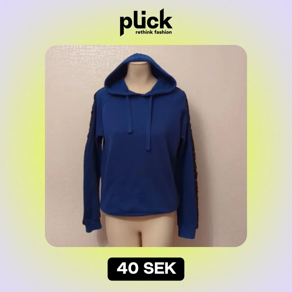 Säljer en snygg blå hoodie från Whales Spirit. Den har en cool detalj med svarta ränder längs ärmarna och en klassisk huva med dragsko. Perfekt för en avslappnad stil eller när du vill hålla dig varm och bekväm.