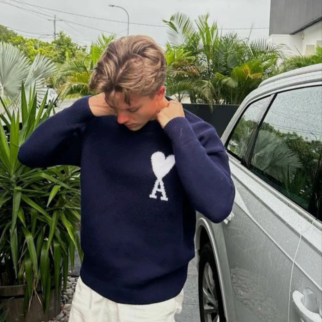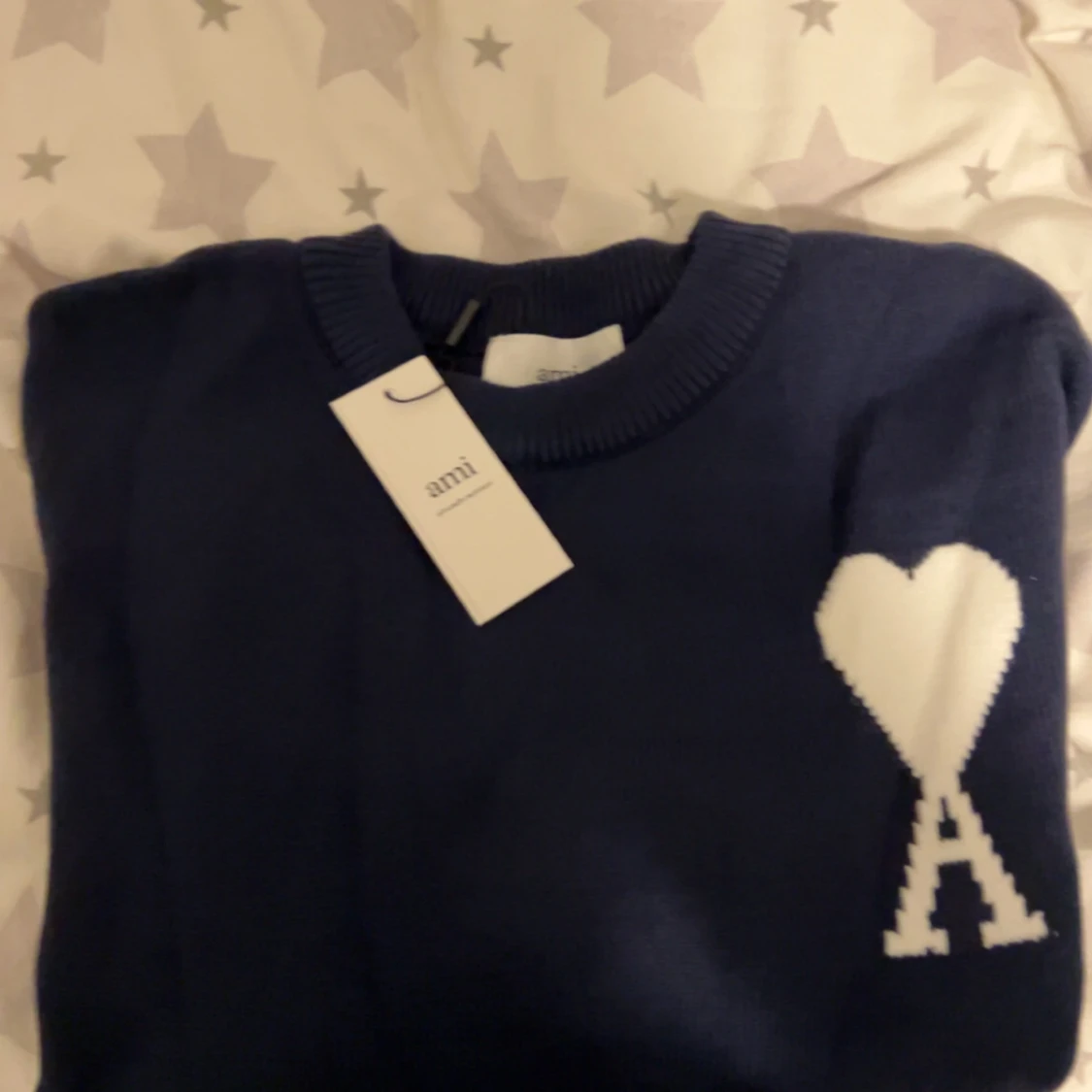 (Har bankutskrift) Säljer en snygg mörkblå tröja från Ami med ett vitt hjärta och bokstaven 'A' på bröstet. Tröjan har långa ärmar och en klassisk rund halsringning. Perfekt för en stilren look.