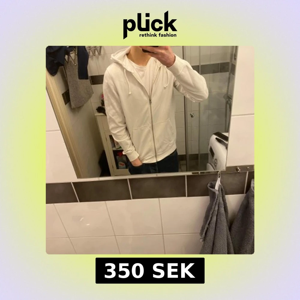 Säljer en stilren vit hoodie med dragkedja och huva. Den har långa ärmar och en bekväm passform. Perfekt för en avslappnad look. Hör av dig vid intresse! Storlek M
