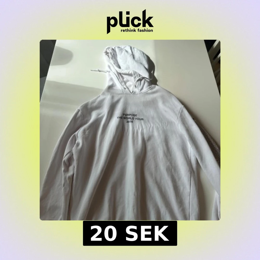 Säljer en vit hoodie från Justin Biebers Purpose World Tour 2016. Tröjan har tryck med turnéns namn fram och bak samt turnéstäder längs ena ärmen. Mjuk insida i fleece, huva med snörning och långa ärmar. Perfekt för dig som älskar streetwear och musikmerch.