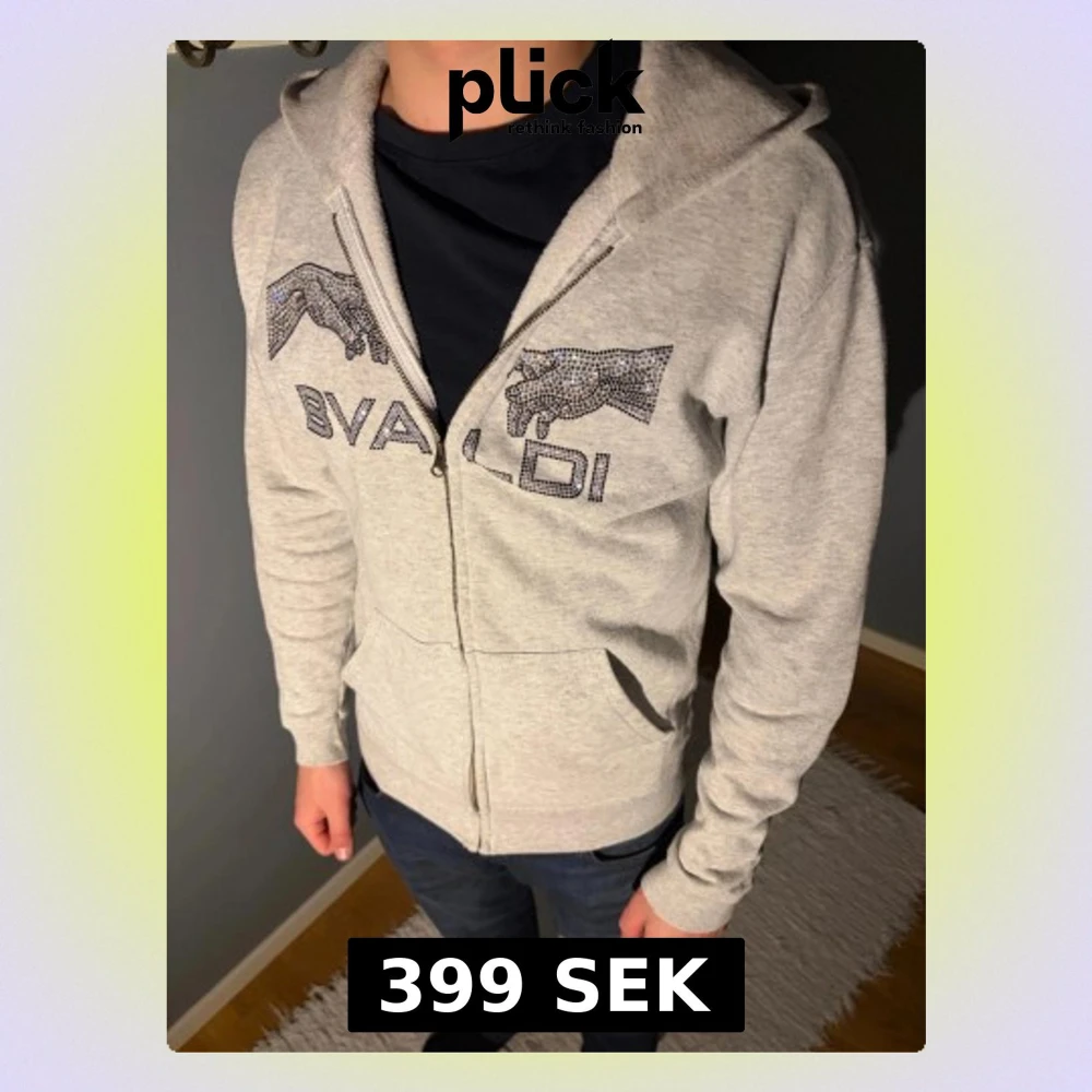 Ljusgrå hoodie från BVALDI med glittrande stenar och logga framtill. Tröjan har huva, dragkedja och fickor på magen. Perfekt för dig som gillar en chill och snygg stil. Passar till jeans eller joggers.