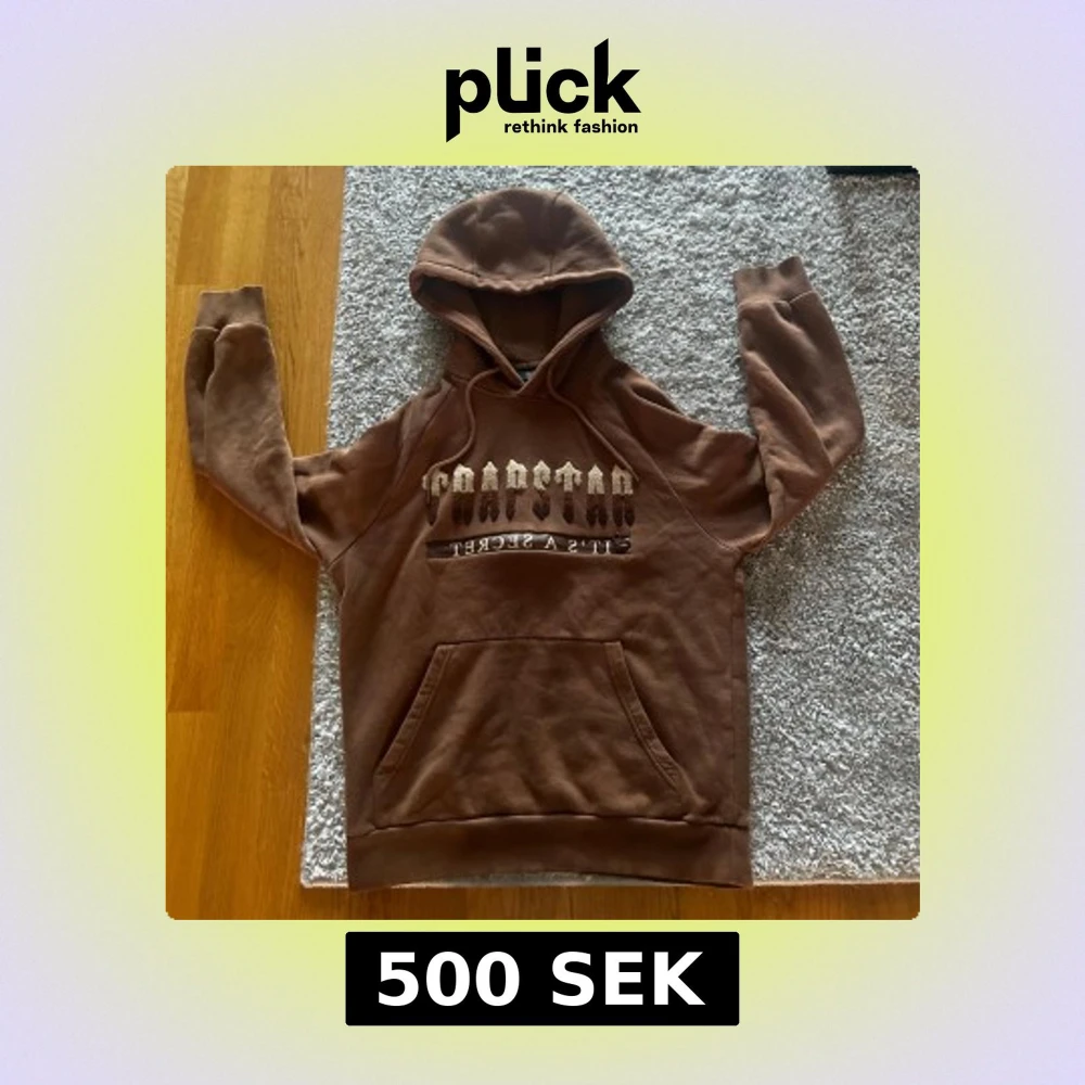 Säljer denna bruna hoodie från Trapstar. Tröjan har huva med snörning, magficka och ett broderat T märke på luvan. Mjuk insida och ribbade muddar vid ärmslut och nederkant. Passar perfekt för en normal dag.