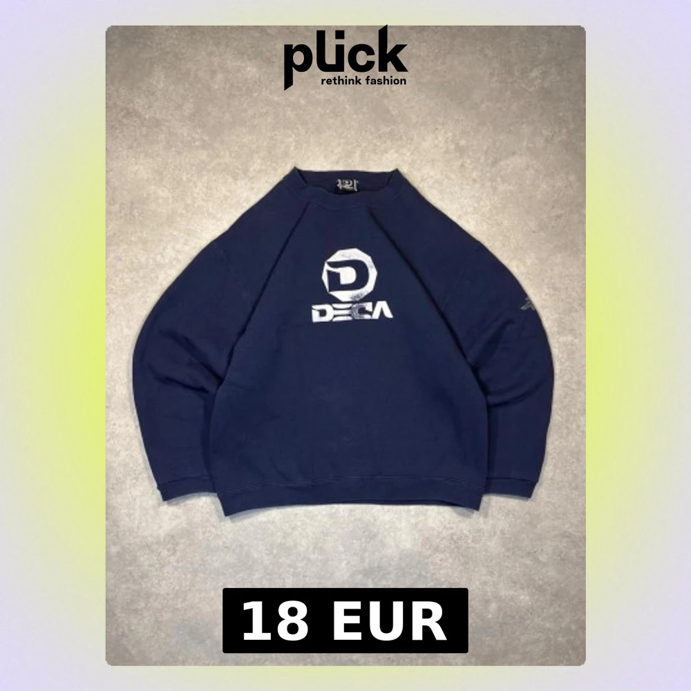Snygg mörkblå sweatshirt från DECA med tryckt logga i vitt på bröstet. Tröjan har rund halsringning, långa ärmar och ribbade muddar vid ärmslut och nederkant. Perfekt för en avslappnad och cool stil. Materialet känns mjukt och bekvämt.