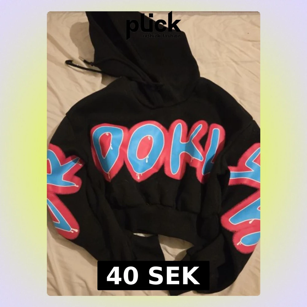 Säljer en svart hoodie med stor huva och färgglad graffiti-inspirerad text i blått och rosa på bröstet och ärmarna. Hoodien har en croppad passform och ribbade muddar. Perfekt för dig som gillar streetwear och vill sticka ut.