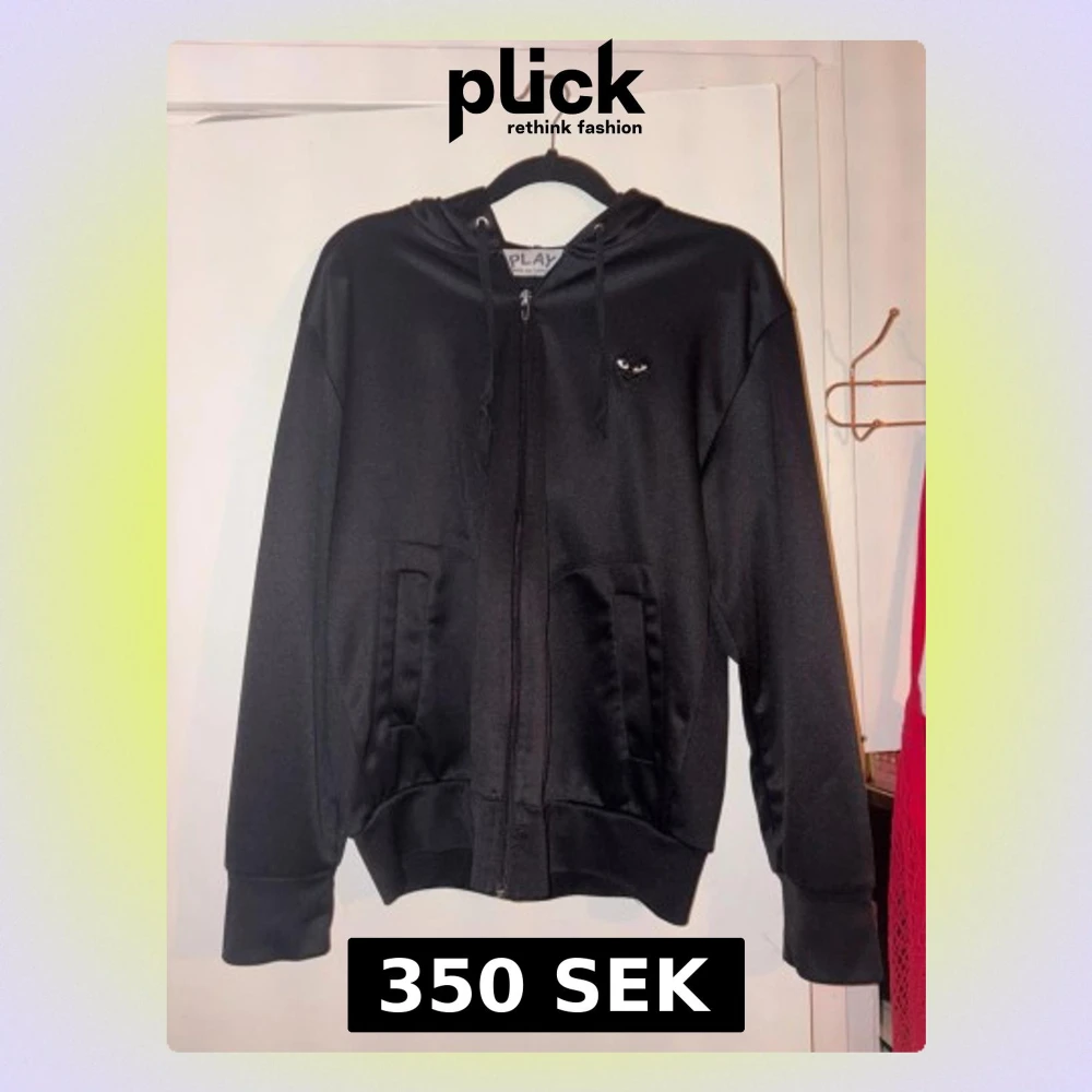 Svart PLAY Comme des Garçons zip-hoodie med ikoniska hjärtloggan. Stilren, minimalistisk design i mjukt och bekvämt material perfekt för både vardag och streetwear. Ett tidlöst plagg från ett eftertraktat designermärke som lyfter vilken outfit som helst.