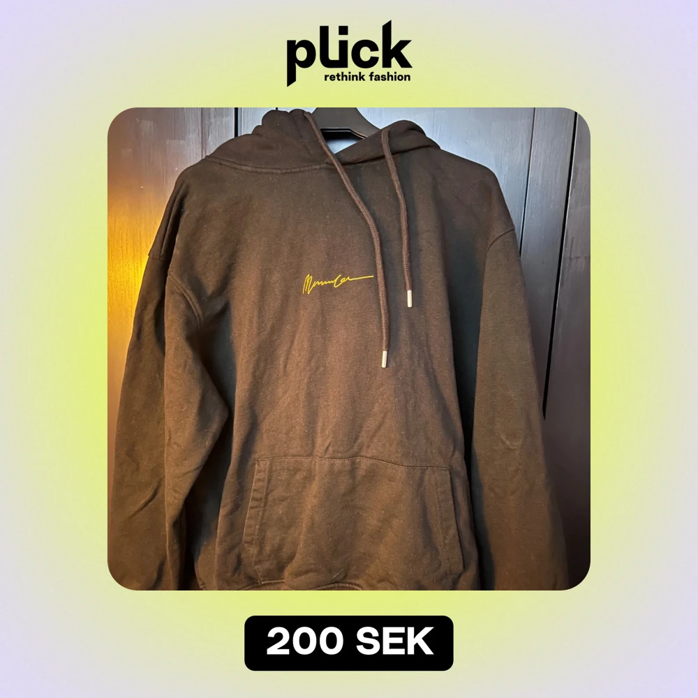 Säljer en svart hoodie med en cool gul text på bröstet. Den har en klassisk känguruficka och justerbar huva med snören. Perfekt för en avslappnad stil och passar till det mesta. Skön och bekväm för både vardag och chill.