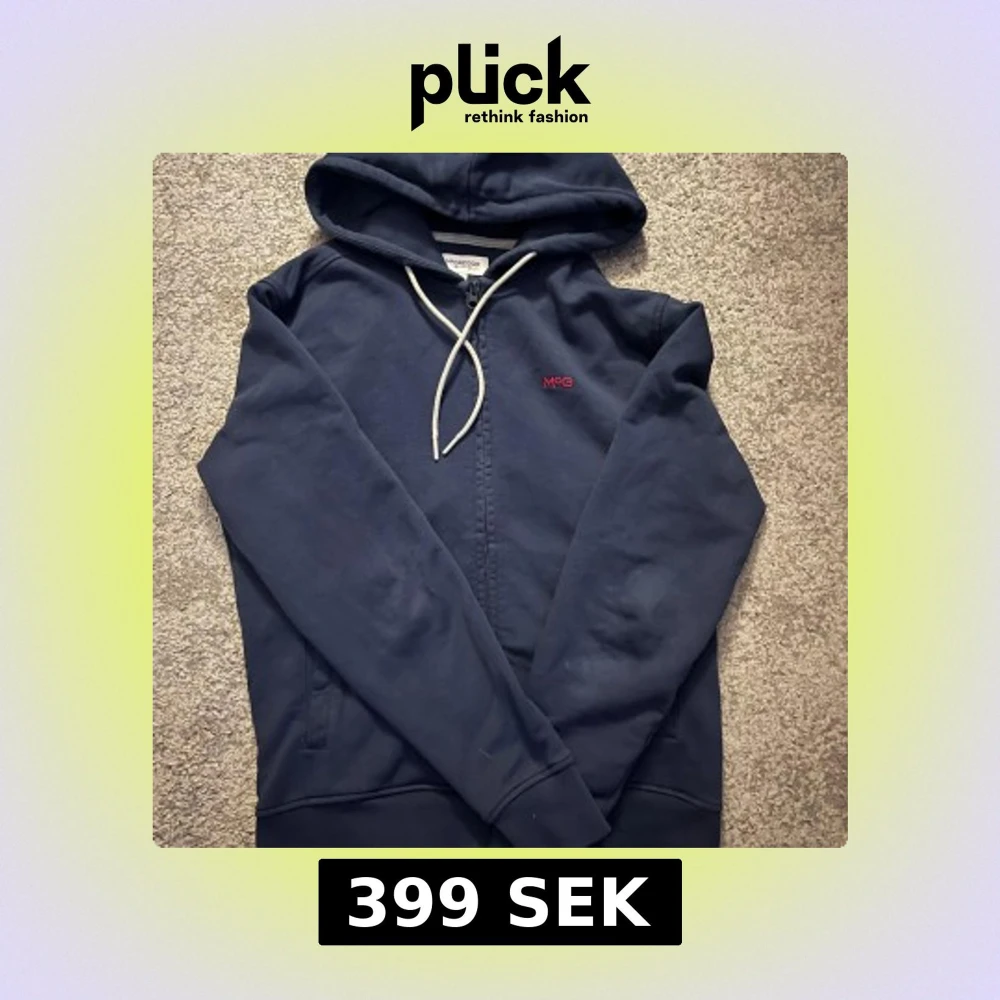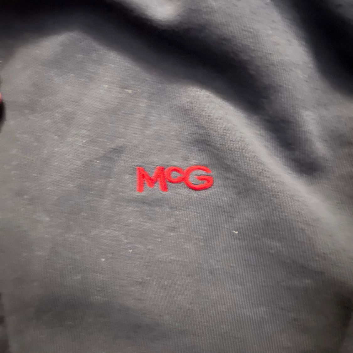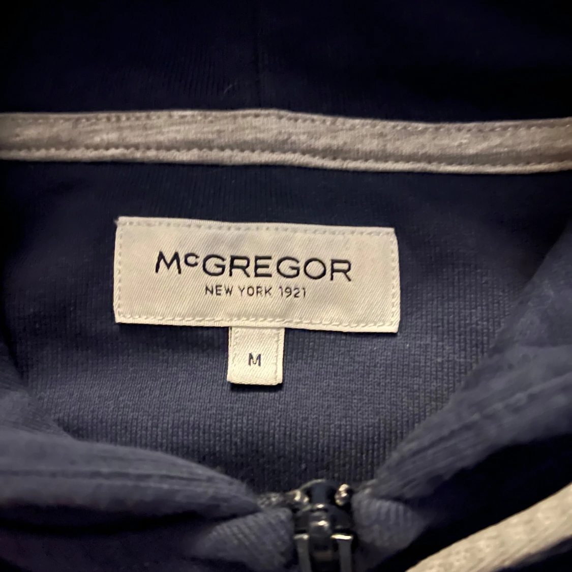 Säljer en snygg mörkblå hoodie från McGregor med dragkedja och broderad logga i rött på bröstet. Den har en justerbar huva med vita snören och långa ärmar. Perfekt för en avslappnad stil.
