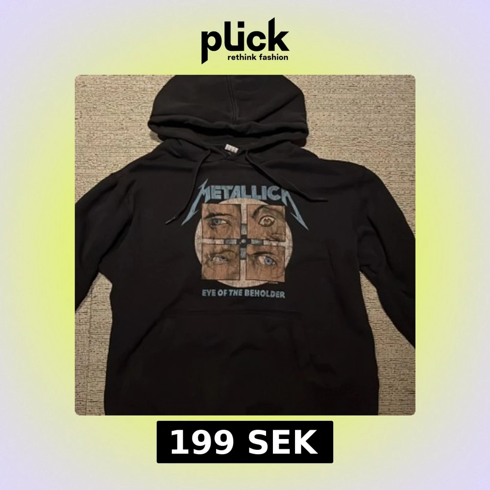 Säljer en svart hoodie från Amplified med Metallica-tryck och texten 'Eye of the Beholder'.