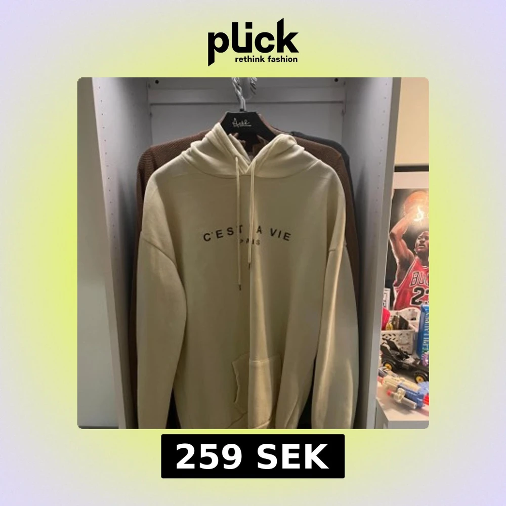 Säljer en beige hoodie med svart text 'C'est La Vie Paris' på bröstet. Tröjan har huva med snörning och en stor magficka. Perfekt för dig som gillar en clean och chill stil. Storlek m. Aldrig använd