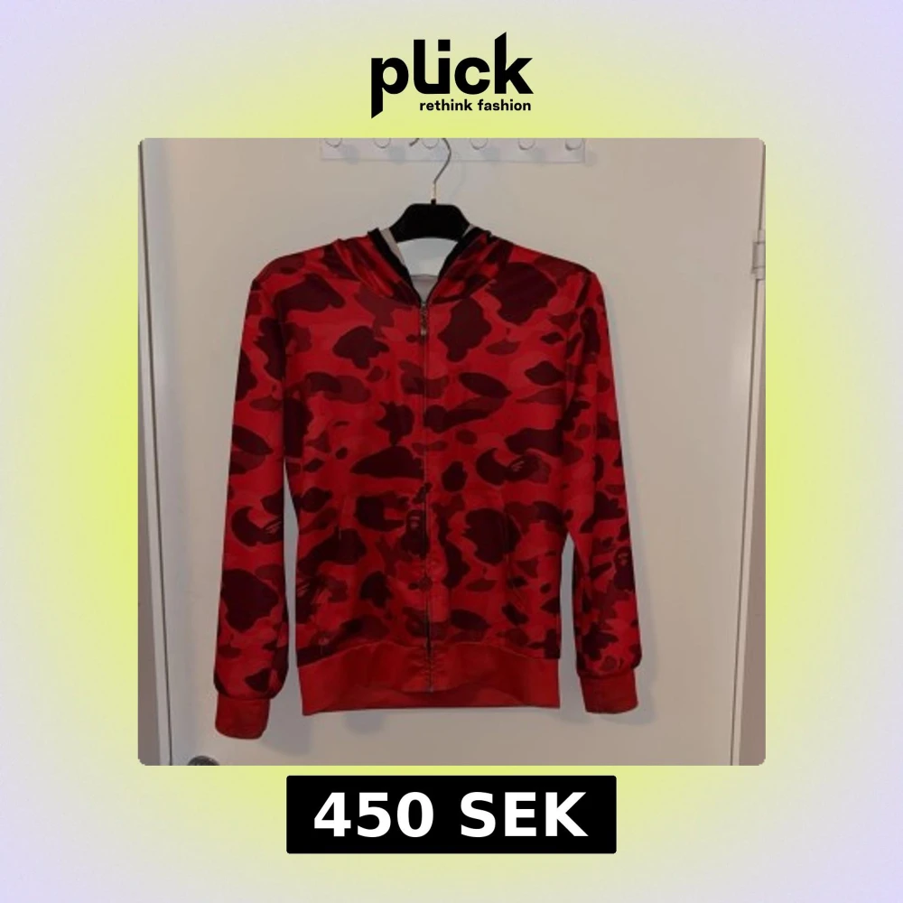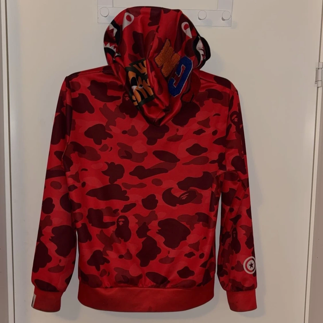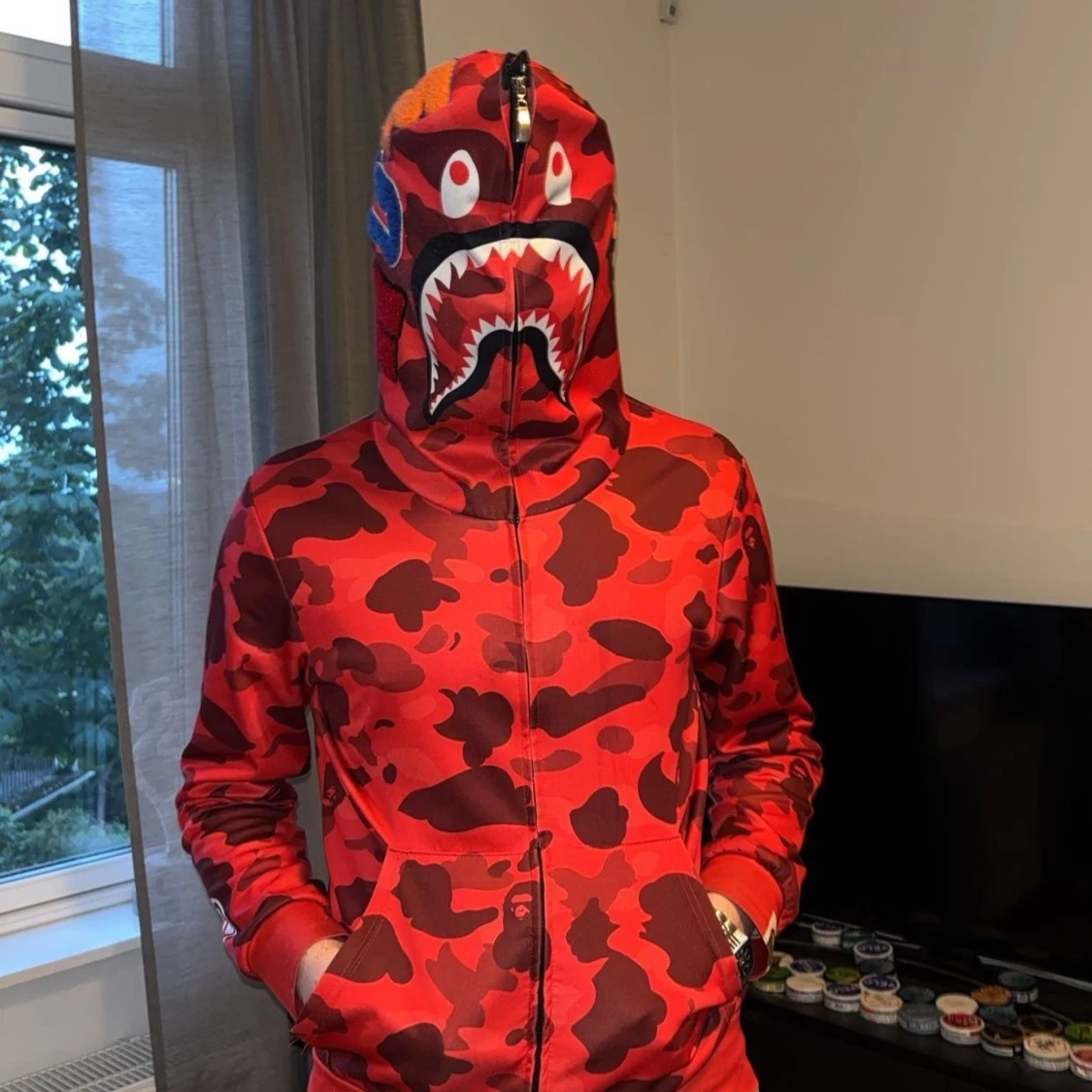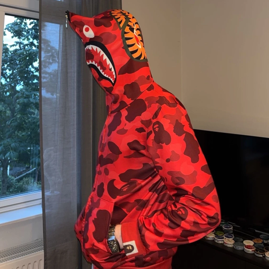 Säljer en ikonisk röd camo hoodie från BAPE med hel dragkedja och shark-motiv på huvan. Hoodien har känguruficka, broderade detaljer och klassisk camo-print i rött och mörkrött. Perfekt statement-plagg för streetwear-entusiasten.