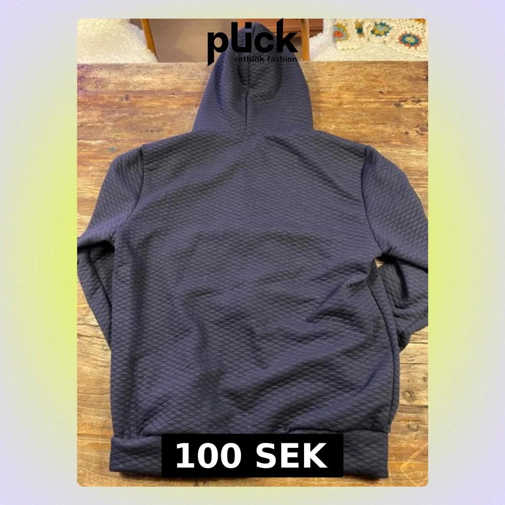 Säljer en mörkblå hoodie med snyggt quiltat mönster och dragkedja framtill. Tröjan har huva med snörning och långa ärmar. Okänt märke. Stor i storlek