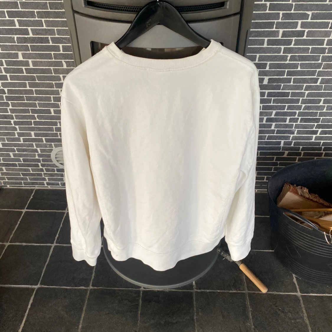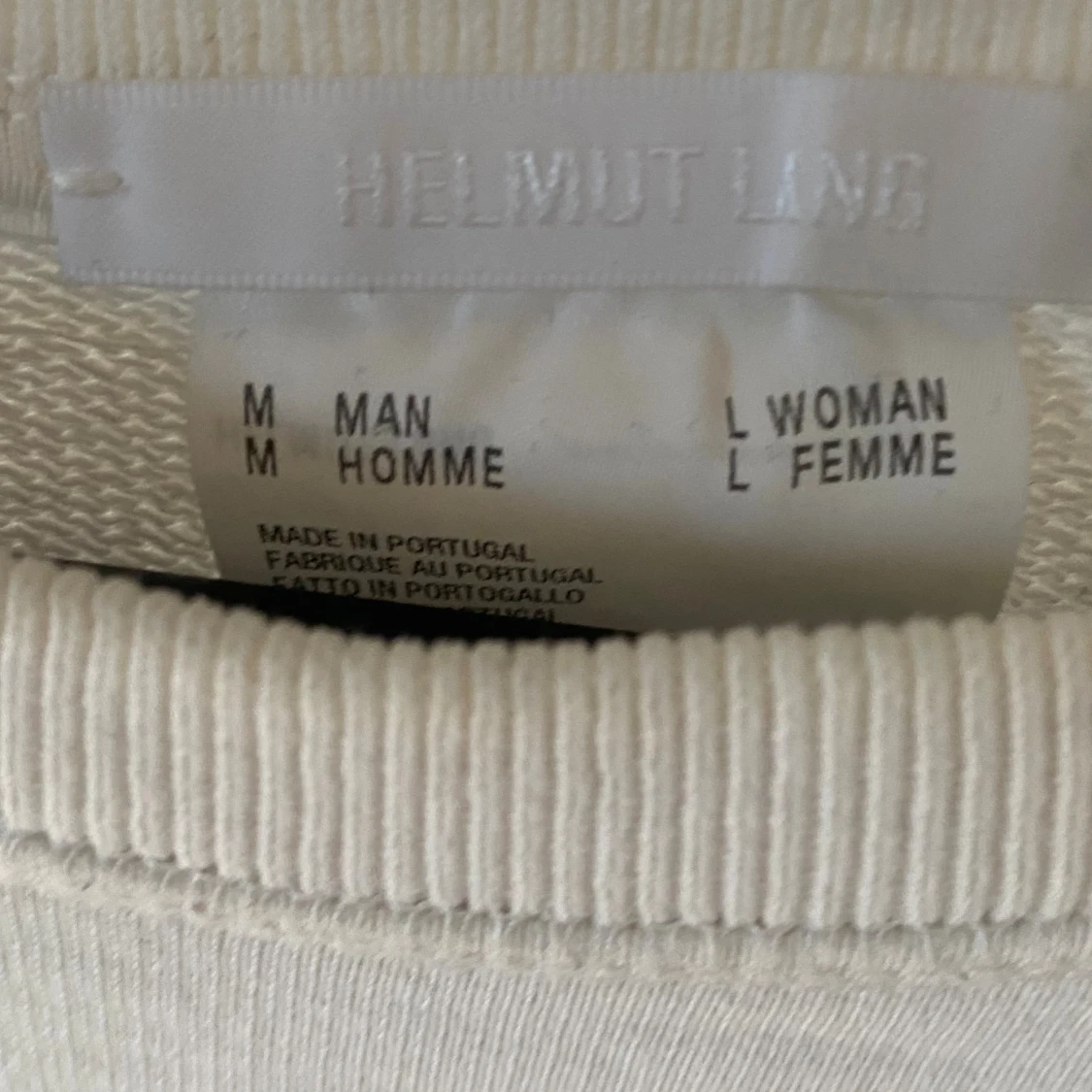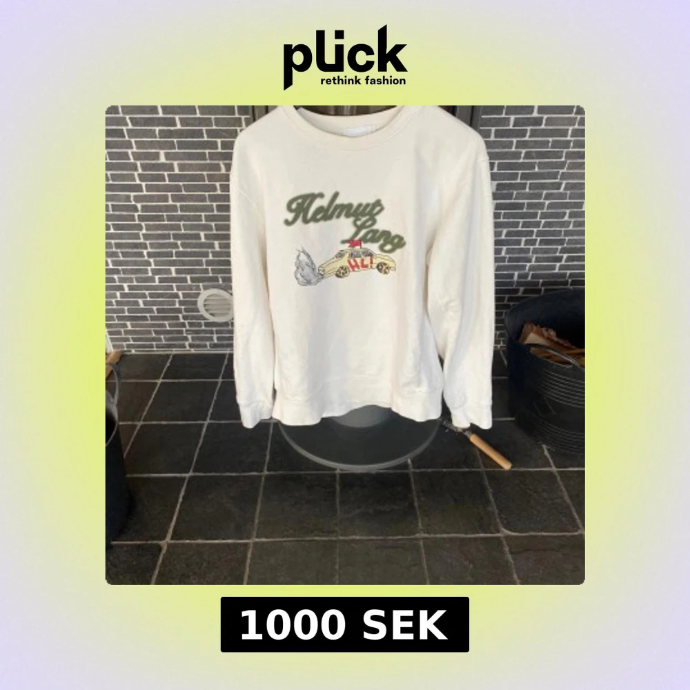 Vintage Helmut Lang tröja i relativt bra skick . En sällsynt och eftertraktad modell. I en off white vit nyans med ett fränt bil tryck . Sidder ganska overshirt