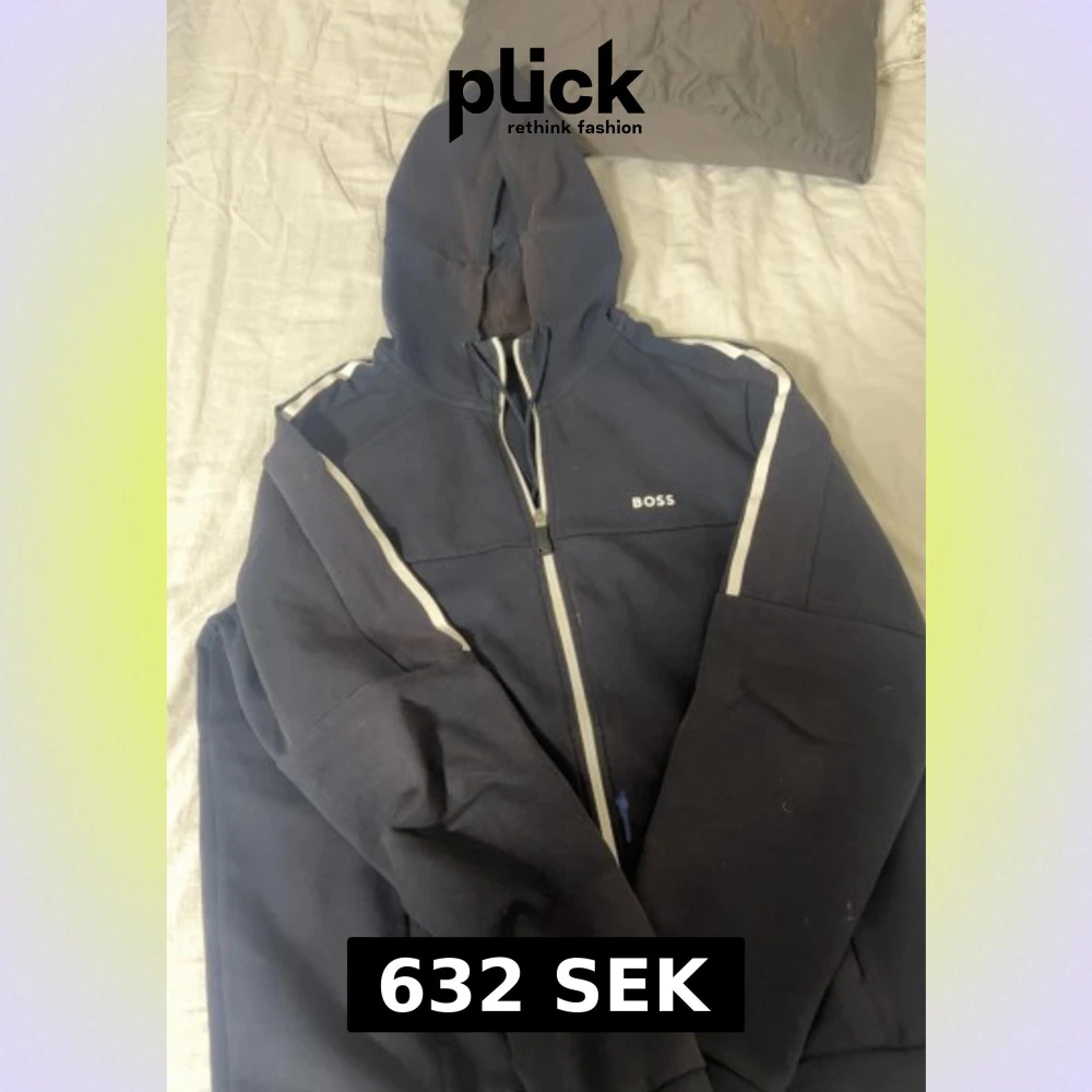 Hugo boss tröja blå,Blivit för stor för mig,den har en liten fläck vilket man ser på bilden som säkert går o ta bort samt har den tappat lite färg på luvan