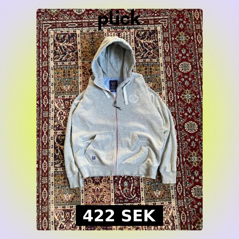 Snygg grå hoodie från Marine Classics med dragkedja, huva och två fickor framtill. Broderad logga på bröstet och en liten patch vid fickan. Mjuk bomullsblandning och ribbade muddar vid ärmslut och midja. Perfekt för en avslappnad stil.