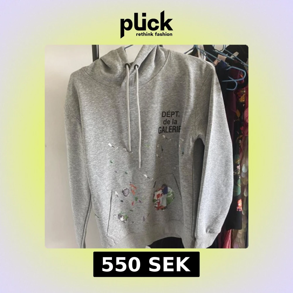 Grå hoodie med tryck 'DEPT. de la GALERIE' på bröstet och färgstänk i olika nyanser framtill. Klassisk känguruficka, snörning i huvan och mjukt material. Skriv vid funderingar!