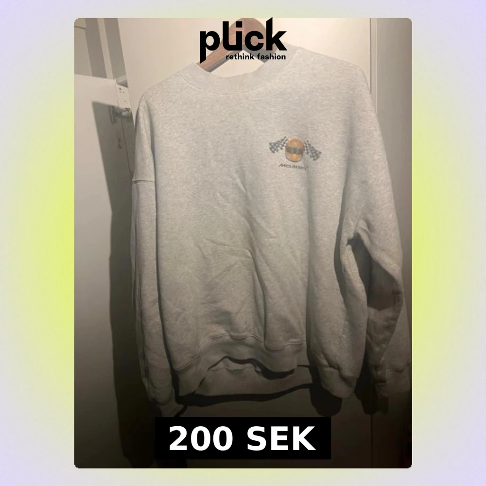 Säljer en grå sweatshirt från McLaren med tryck av racinghjälm och flaggor fram samt stort motiv av Formel 1-bil och texten 'McLaren Formula 1 Team' och 'MCL60' på ryggen. Tröjan har rund hals, ribbade muddar och är i mjukt material. Perfekt för motorsportfans!
