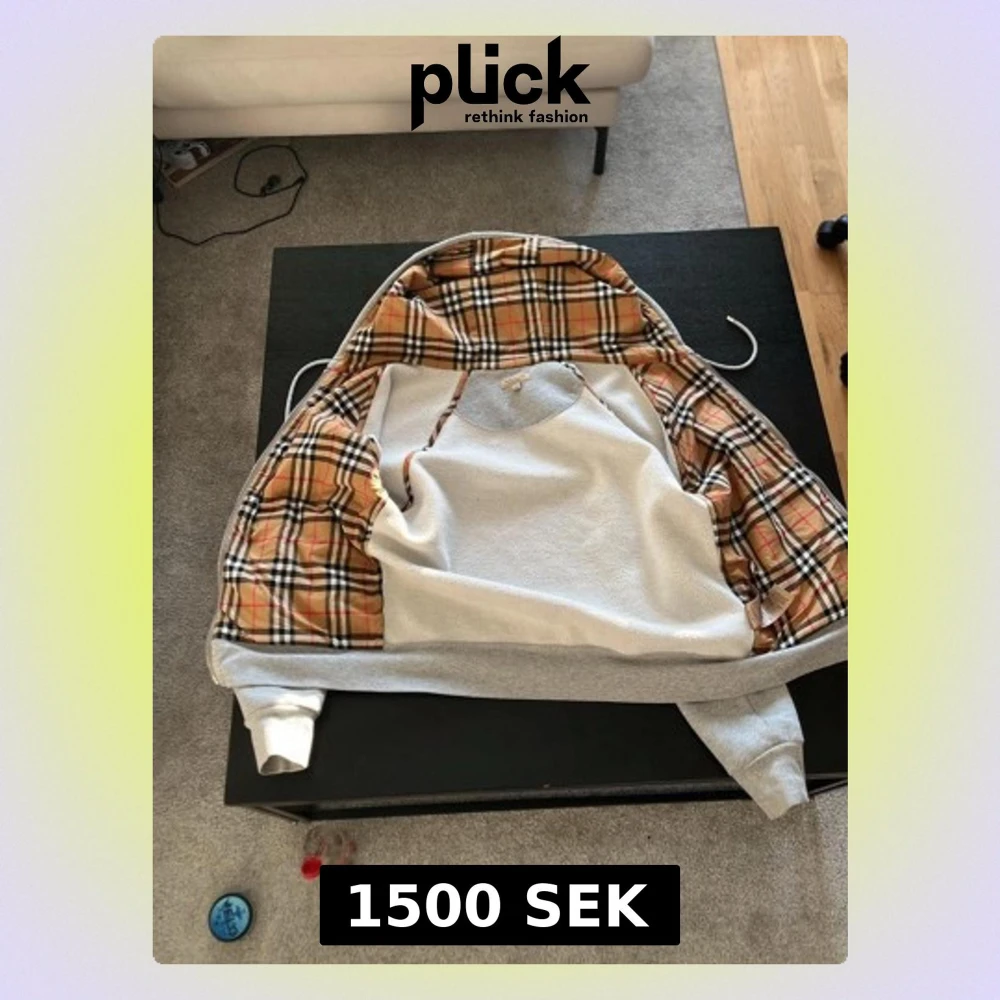 Snygg grå hoodie med klassiskt Burberry-inspirerat rutigt foder i beige, svart och rött. Hoodien har huva med dragsko och ribbade muddar vid ärmar och midja. Perfekt för dig som vill ha en unik twist på din vardagsstil.