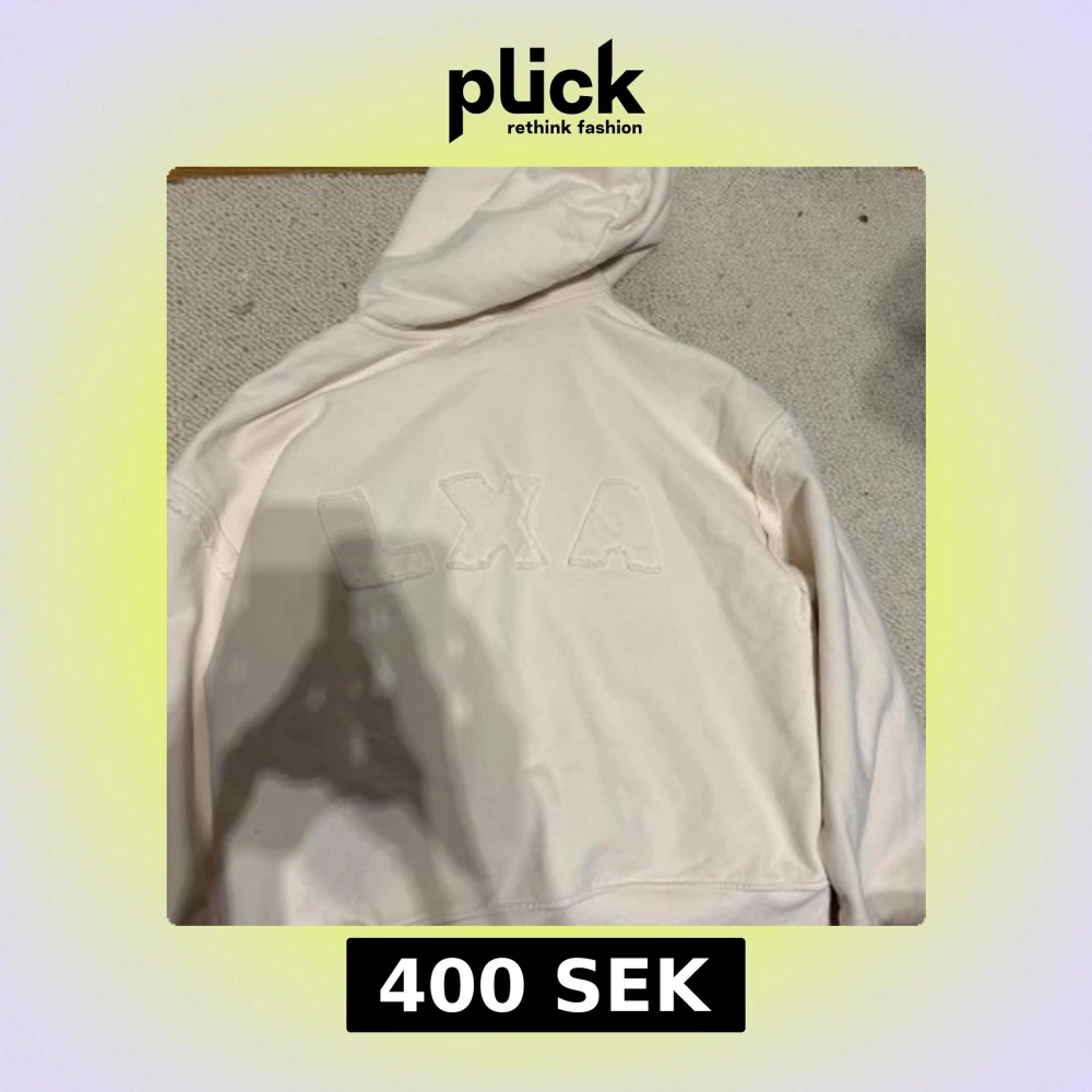 Säljer en stilren beige hoodie från LXA med broderade bokstäver på ryggen. Tröjan har huva, långa ärmar och är gjord i mjuk bomull. Perfekt för dig som gillar en clean och enkel look.