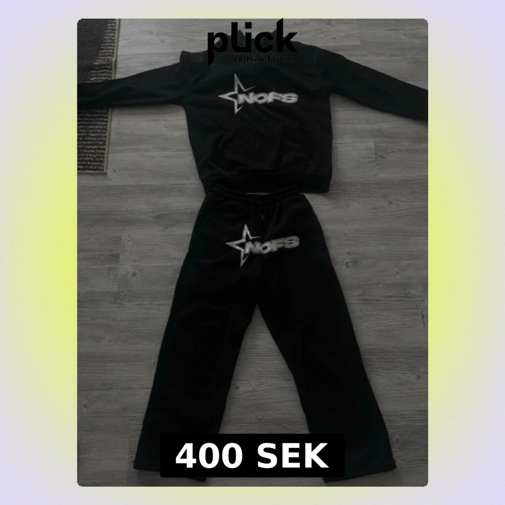 Svart tracksuit set från NOFS med matchande tröja och byxor. Båda plaggen har en stor vit NOFS-logga med stjärndesign framtill. Byxorna har resår i midjan och sidofickor. Perfekt för chill dagar hemma. Storlek M men passar även S. 250 per piece eller 400 för setet
