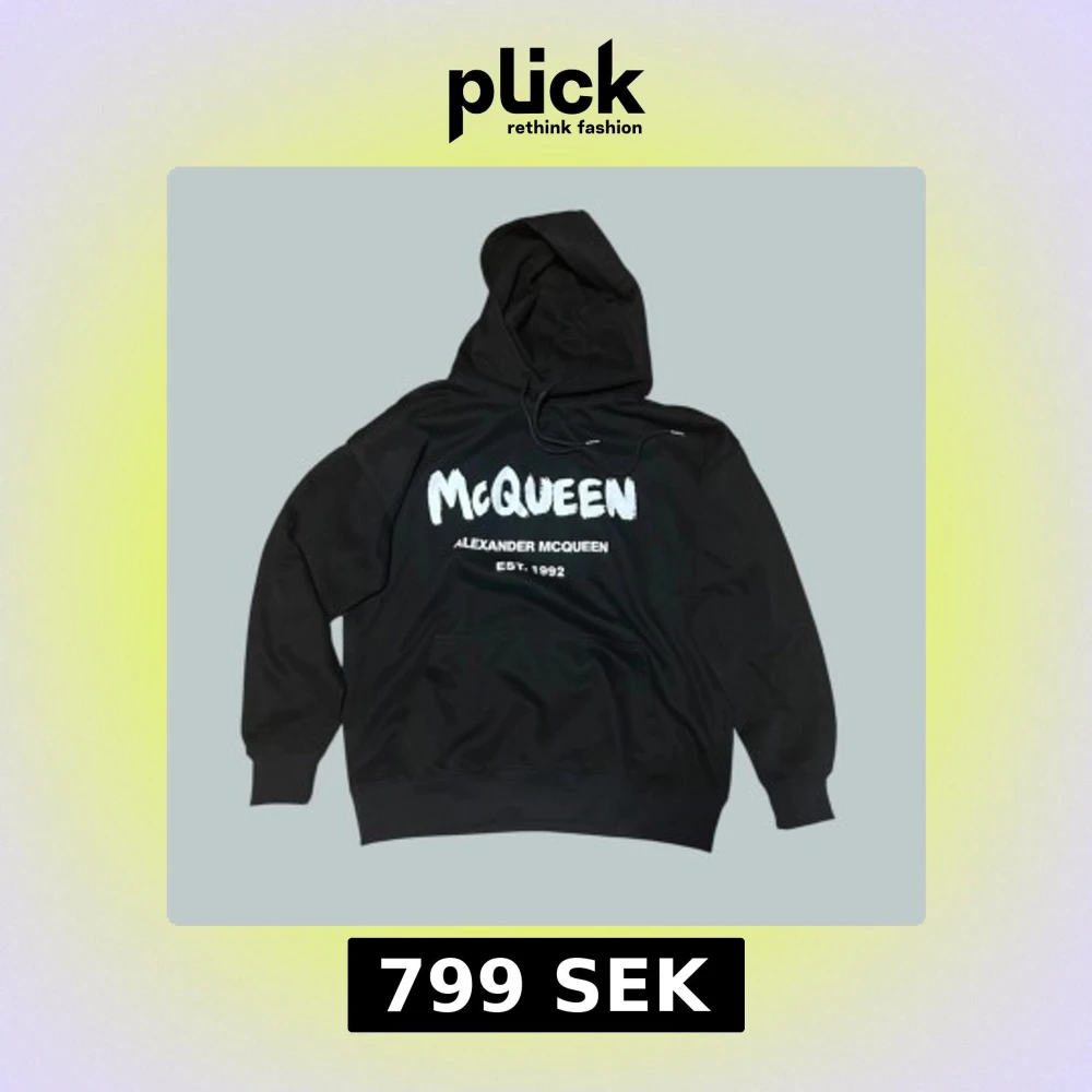 Svart hoodie från Alexander McQueen med stor vit logga och text på bröstet. Klassisk huva med snörning och känguruficka framtill. Perfekt för dig som gillar streetwear och vill sticka ut med en ikonisk design. Helt okej skick men lite använd.