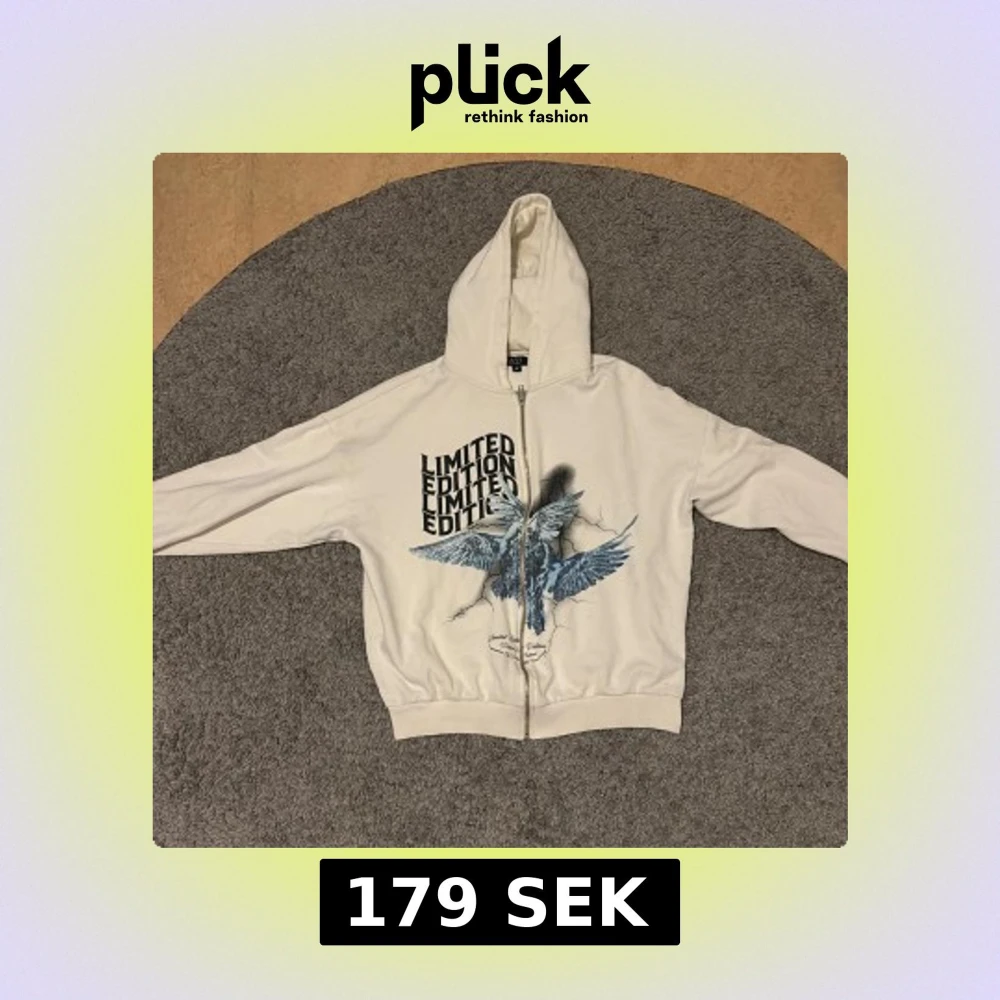 Vit hoodiejacka från BoohooMAN i storlek M. Framsidan har tryck med texten 'LIMITED EDITION' och en blå fågelgrafik. Jackan har huva, hel dragkedja och ribbade muddar. Perfekt för dig som gillar streetstyle och unika prints.