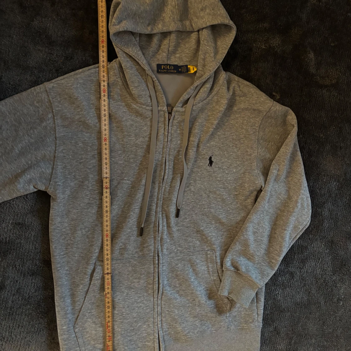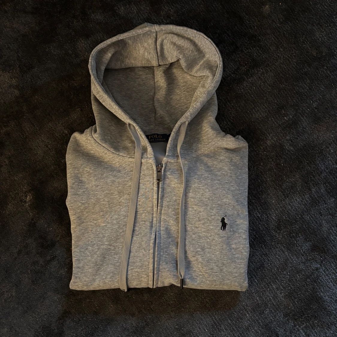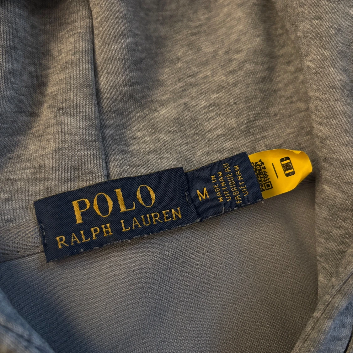 Klassisk grå hoodie från Polo Ralp Laruen med dragkedja, huva med snörning och broderad logga på bröstet. Mjuk bomullsblandning, ribbade muddar och två fickor framtill. Perfekt för chill dagar eller när du vill ha en clean look.