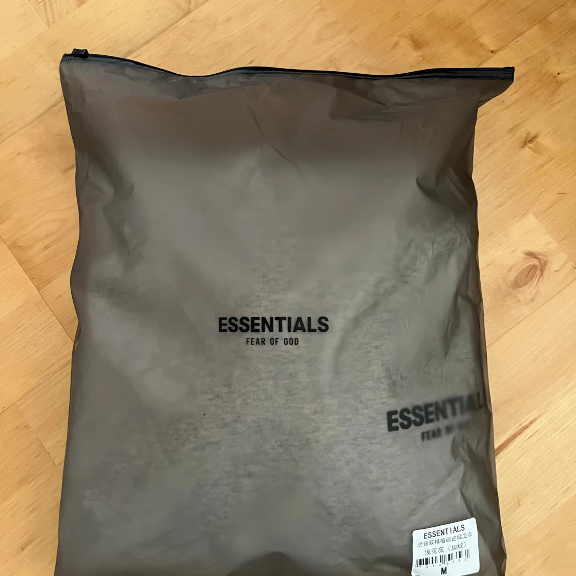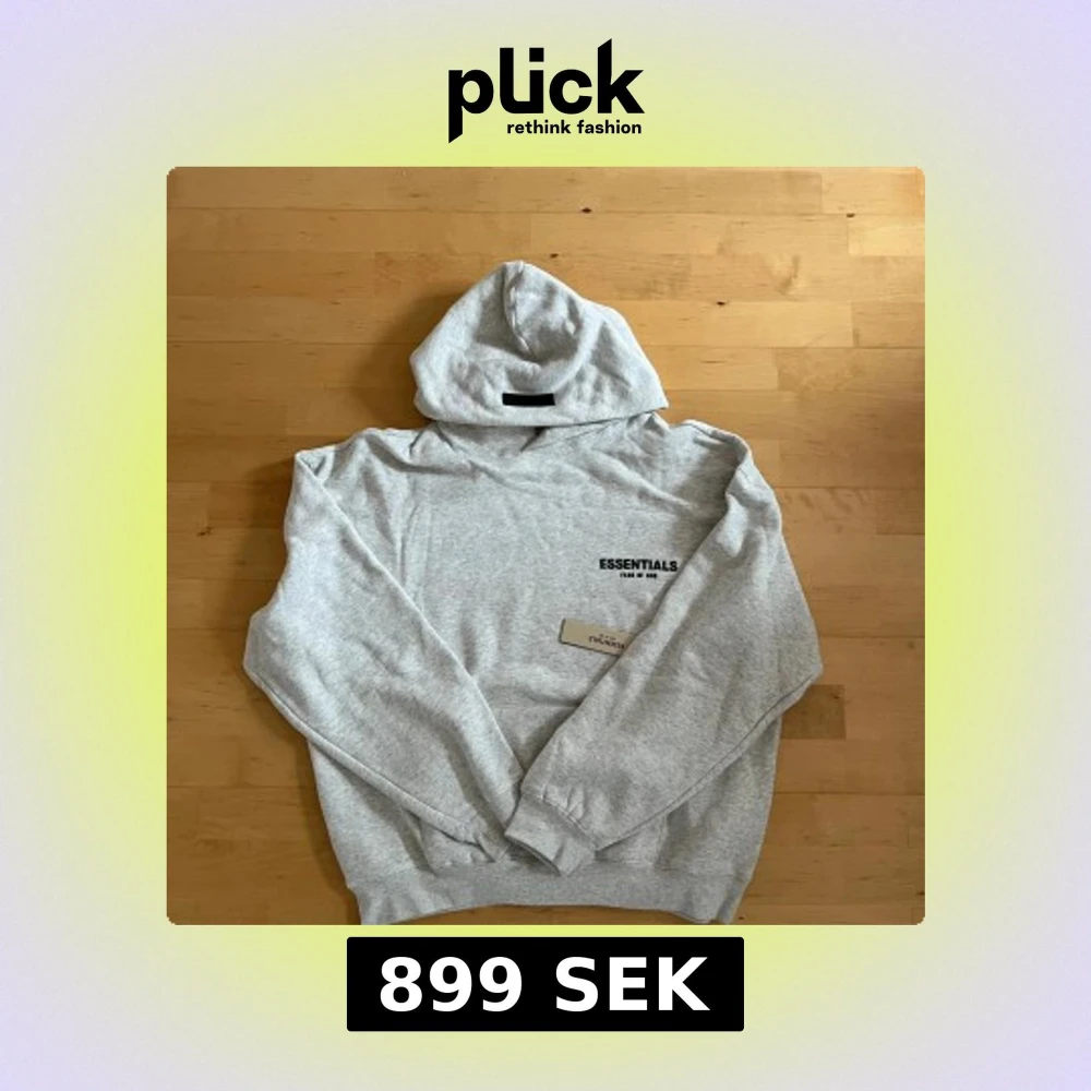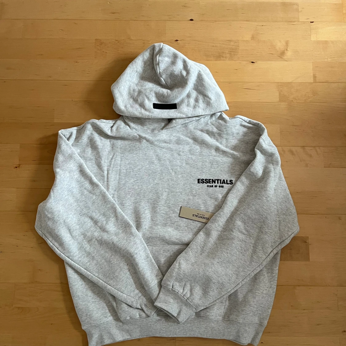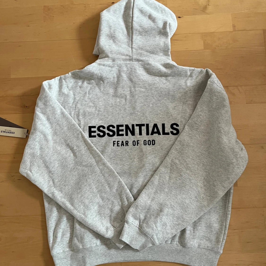 Snygg ljusgrå hoodie från Essentials Fear of God med svart logotyptryck både fram och bak. Tröjan har huva, ribbade muddar och en klassisk känguruficka. Perfekt för dig som gillar streetwear och vill ha en clean look.